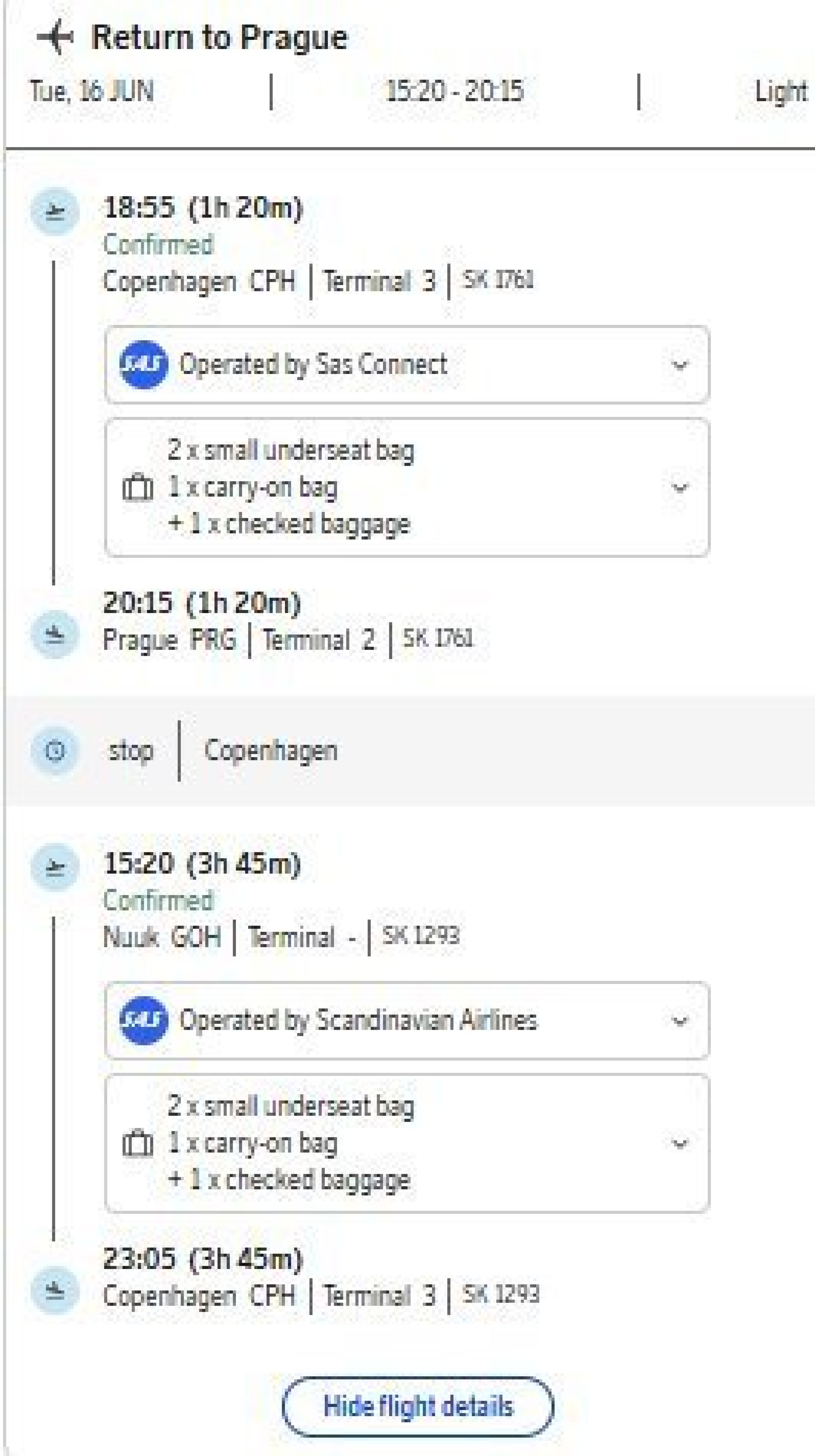 Cuando busco alternativas en el calendario, los vuelos del martes Nuuk - Copenhague ( p.ej. 16.6.) están disponibles , pero cuando introduzco Nuuk -Praga para el 16.6. se resalta en rojo que los vuelos no están disponibles. Los vuelos de Copenhague a Praga el 17.6. están disponibles.