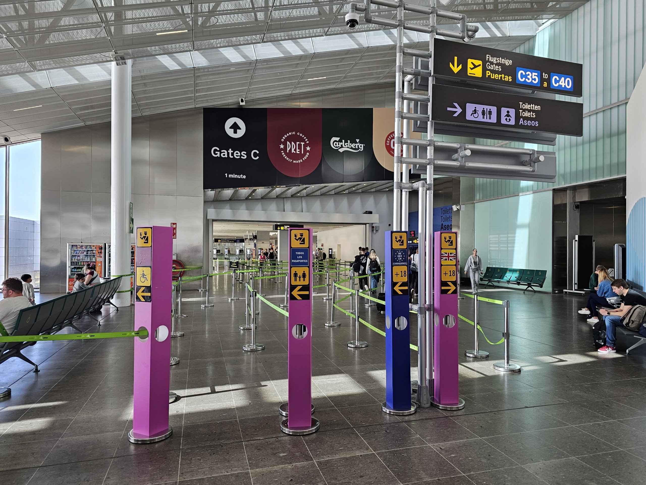 La separación entre vuelos Schengen y no Schengen tiene lugar detrás de un único control de seguridad común. Las puertas de embarque A1-A7, B9-B10 y C35-C40 están detrás del control de pasaportes y sólo están asignadas para salidas hacia países no Schengen.