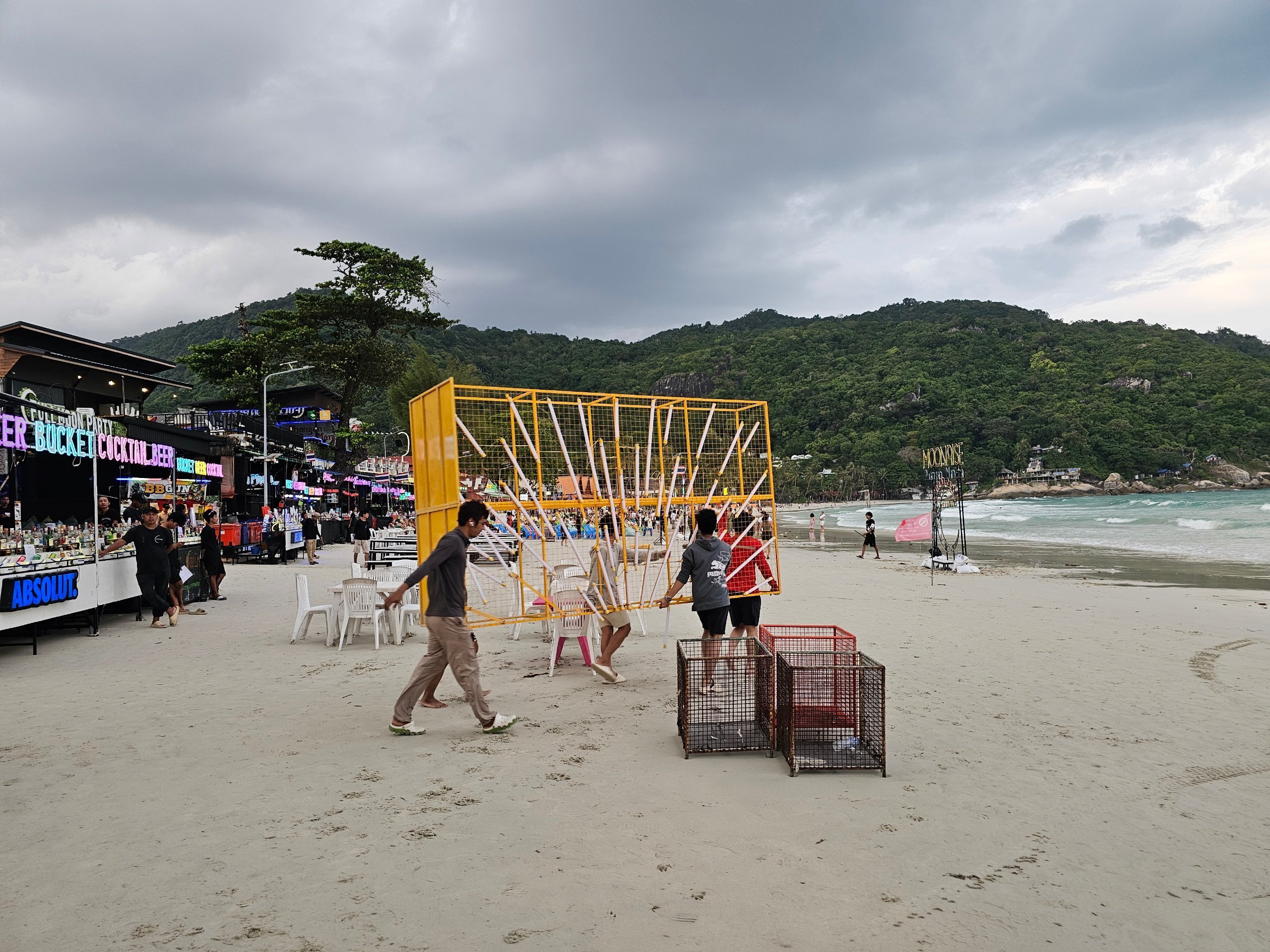 Nuestra primera visita a la playa de Haad Rin fue por la tarde, cuando los preparativos aún estaban en marcha.