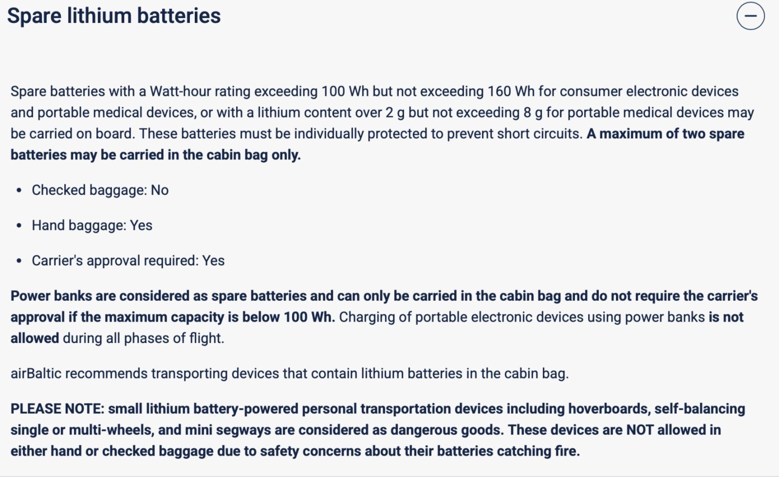 airBaltic también prohíbe el uso de baterías de a bordo: https://www.airbaltic.com/en/bag...strictions