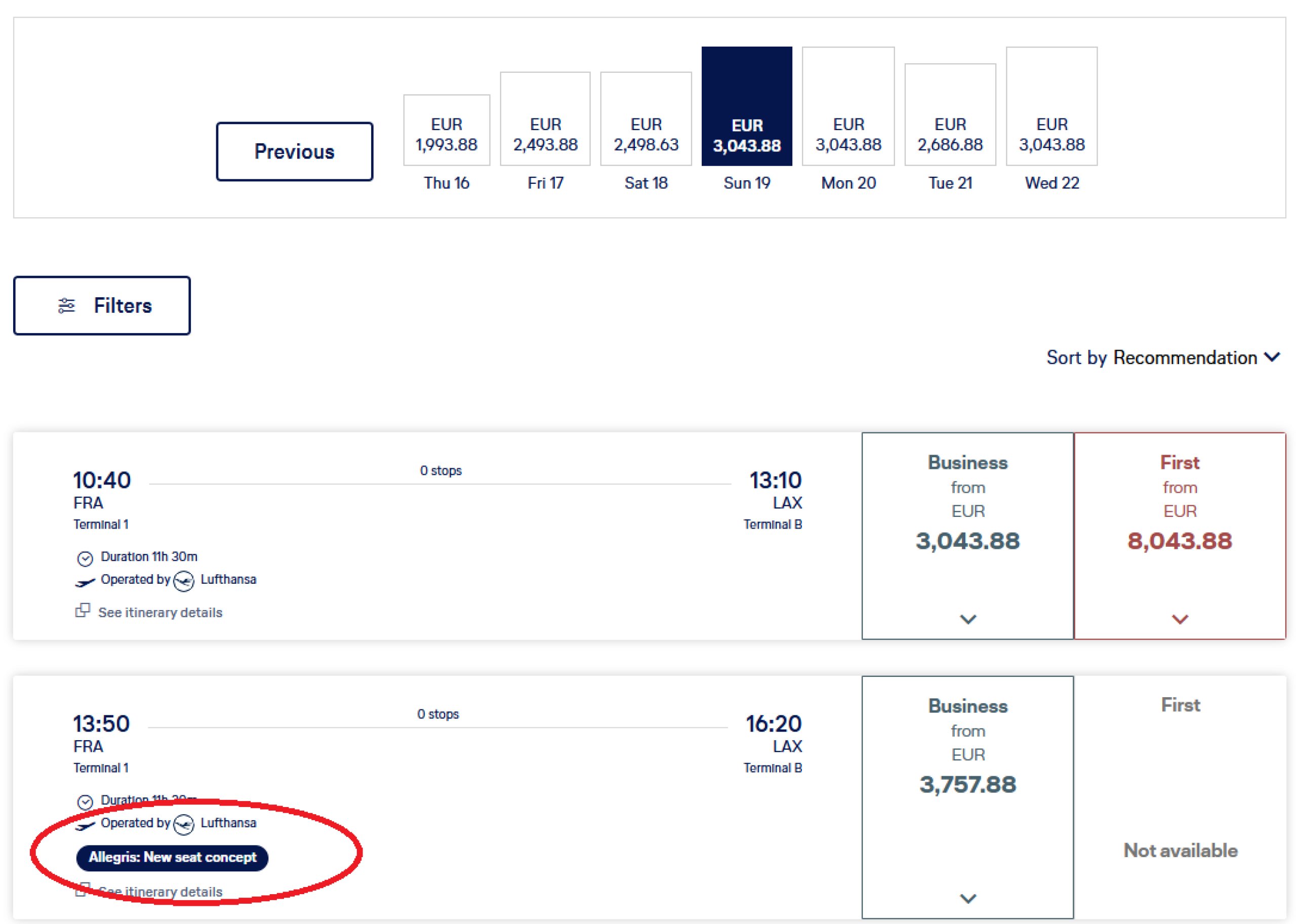 Siempre es importante elegir un número de vuelo concreto. En algunas rutas (por ejemplo, Fráncfort - Los Ángeles) hay varios vuelos al día, pero sólo uno de ellos está equipado con asientos Allegris.
