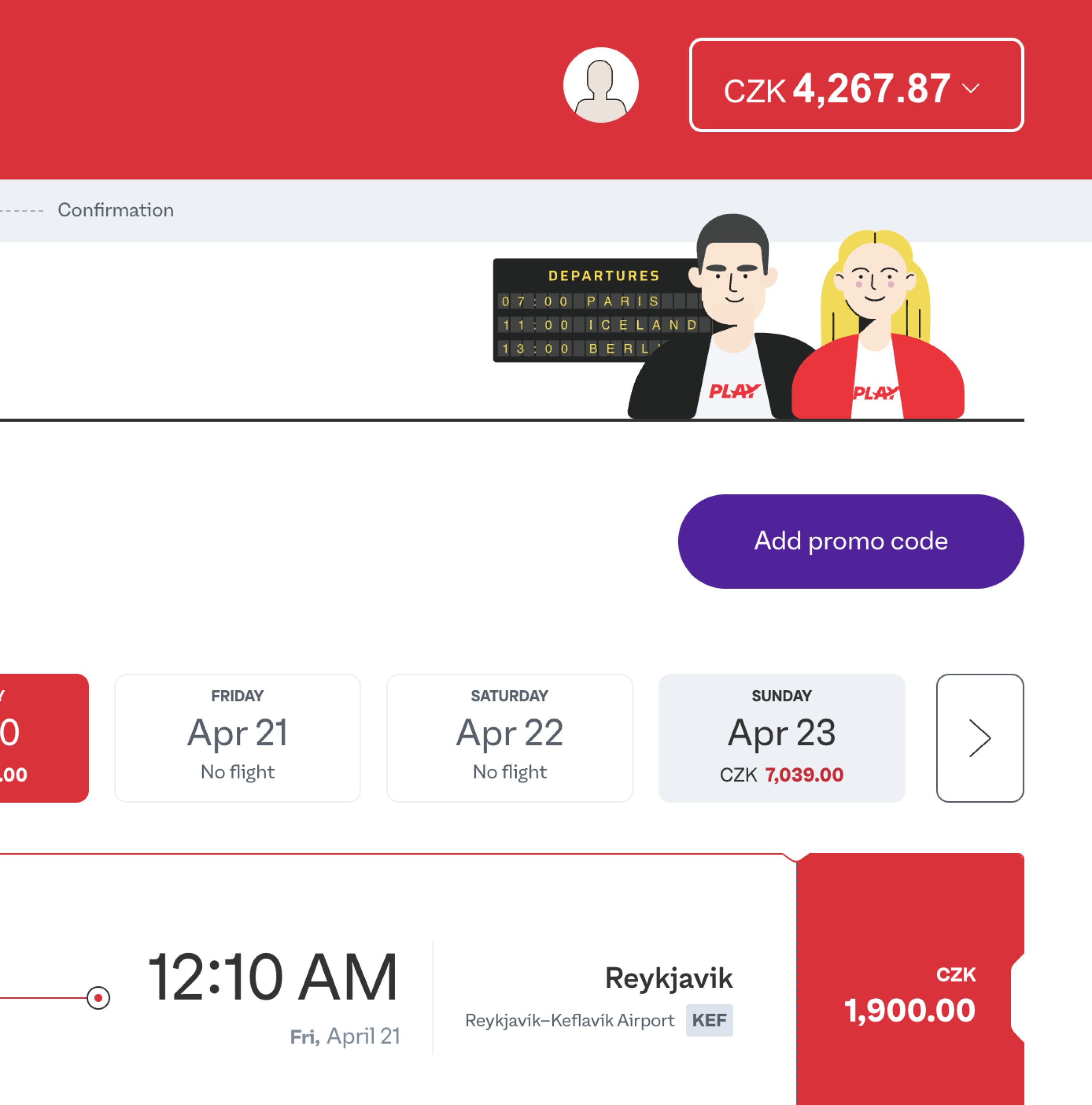 ¿Tiene un código promocional válido y actual con Play Airlines y no sabe dónde introducirlo? En primer lugar, busque vuelos, seleccione fechas específicas en el calendario y continúe con el programa de vuelos detallado.