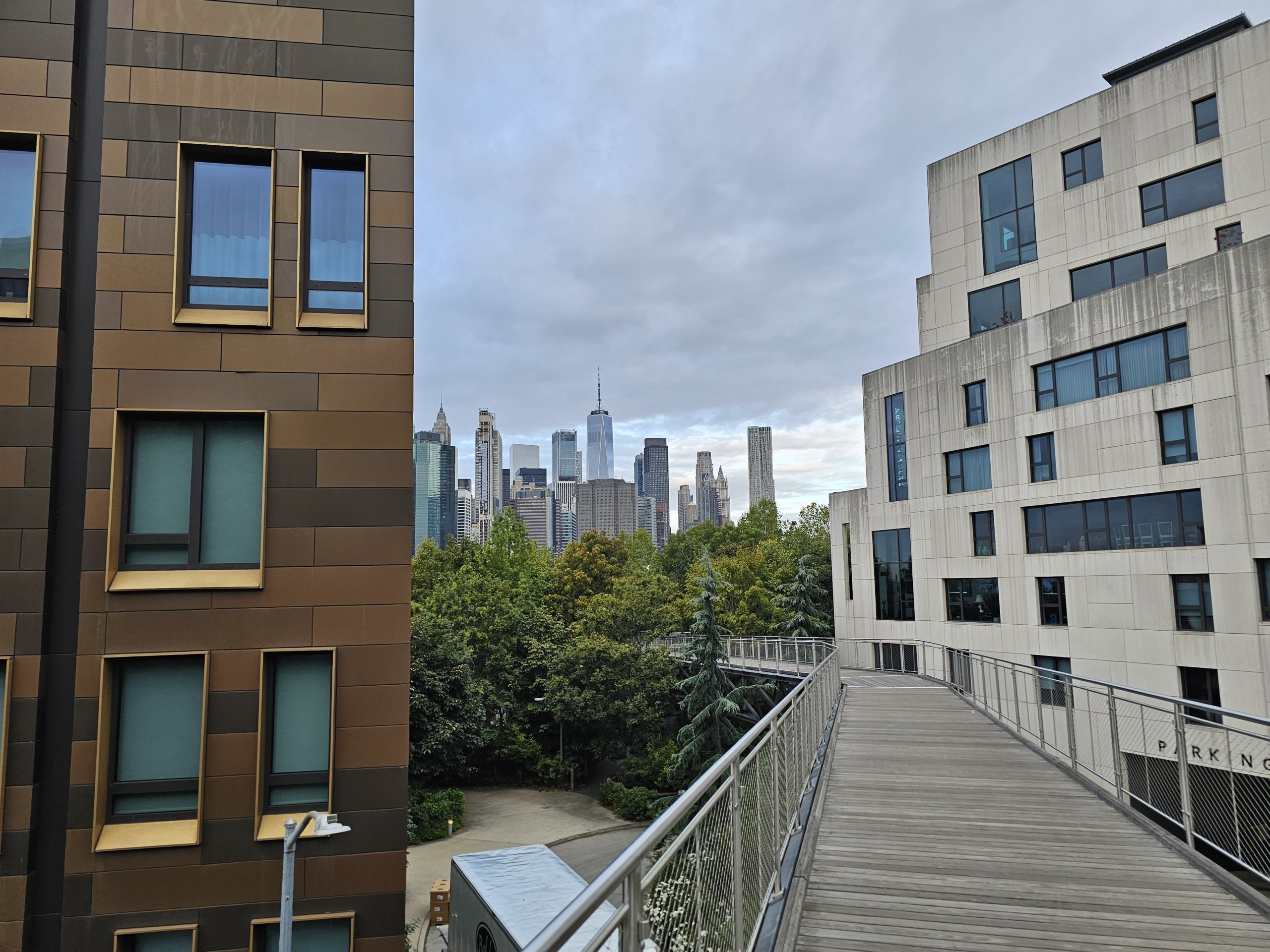 Interesantes vistas no sólo de la lejana Manhattan, sino también de una de las torres del Puente de Brooklyn, pueden contemplarse desde el corto puente peatonal del Parque Squibb, que linda directamente con el Parque del Puente de Brooklyn.