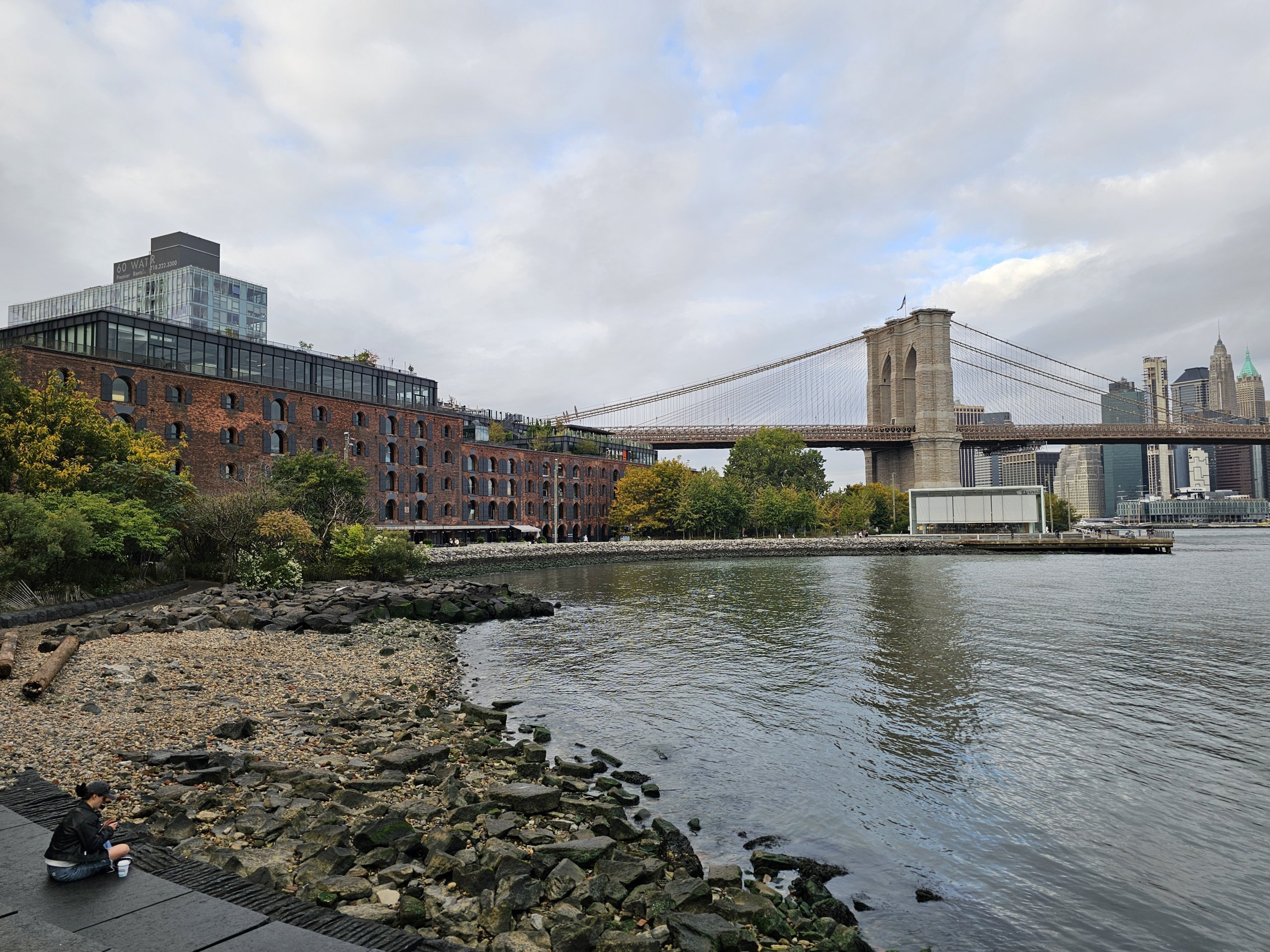 Desde la orilla del río se pueden ver los puentes de Manhattan y Brooklyn y el perfil de Manhattan al fondo.