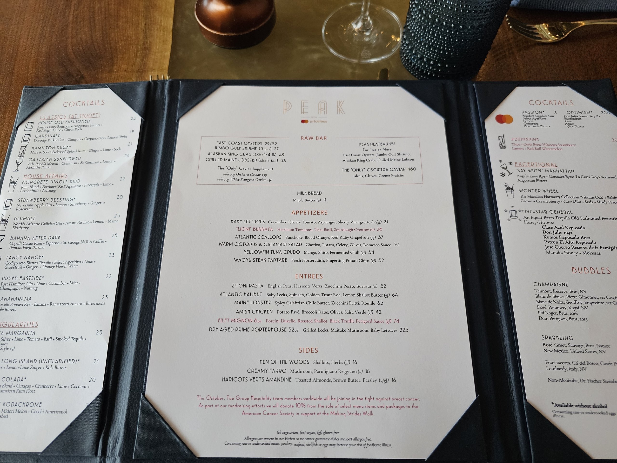 Puedes ver el menú completo en la página web del restaurante: peaknyc.com/restaurant-bars.