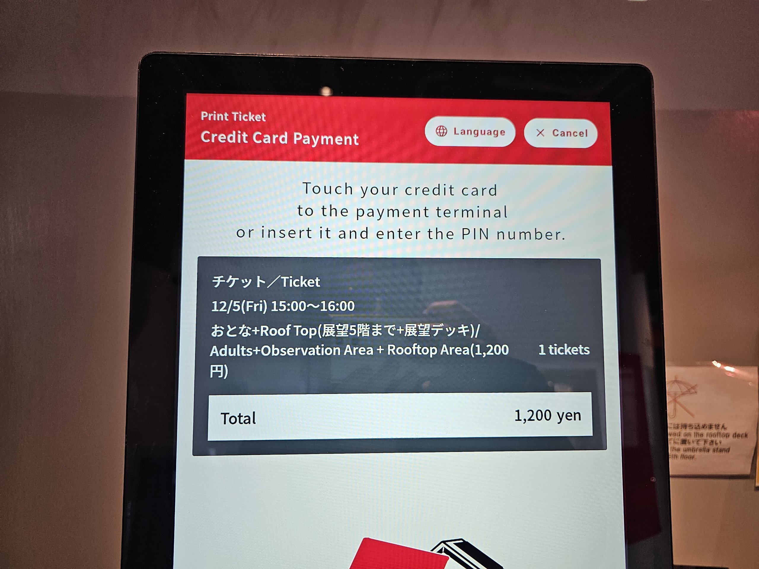 Las entradas pueden adquirirse en la máquina expendedora con tarjeta de crédito o tarjeta IC japonesa. No se acepta dinero en efectivo.