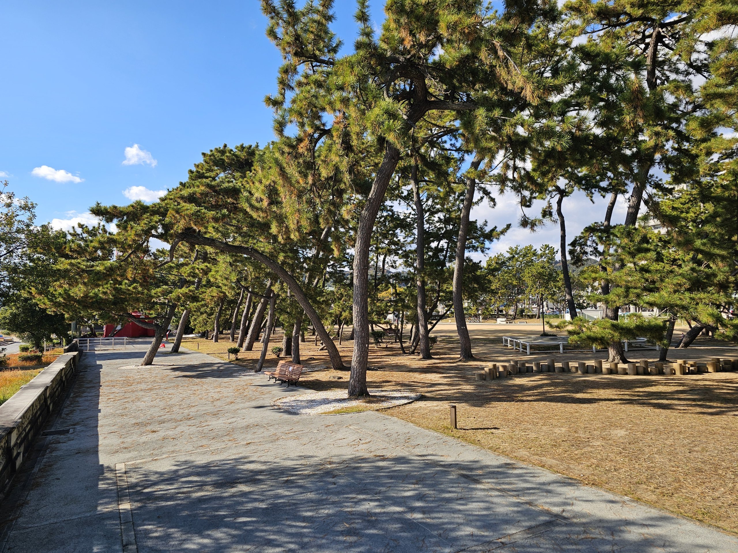 Hay un bonito parque de pinos a lo largo de la playa, y se puede hacer una foto del pequeño faro rojo a mitad de la playa.