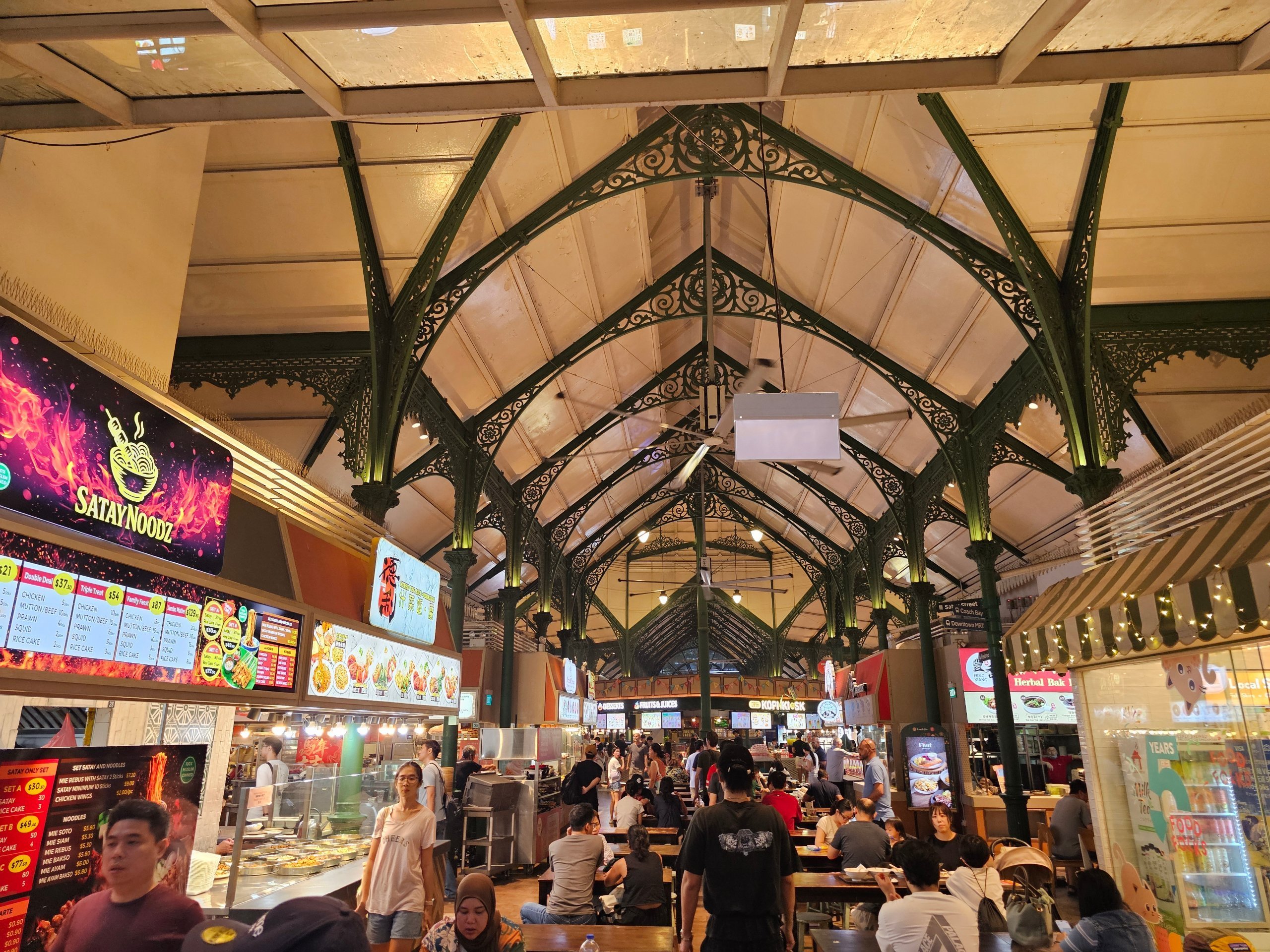 De hecho, a diferencia de la mayoría de los demás centros de venta ambulante, está situado en un histórico edificio de hierro fundido de finales del siglo XIX, en medio del moderno distrito financiero, cerca de la zona de Marina Bay.