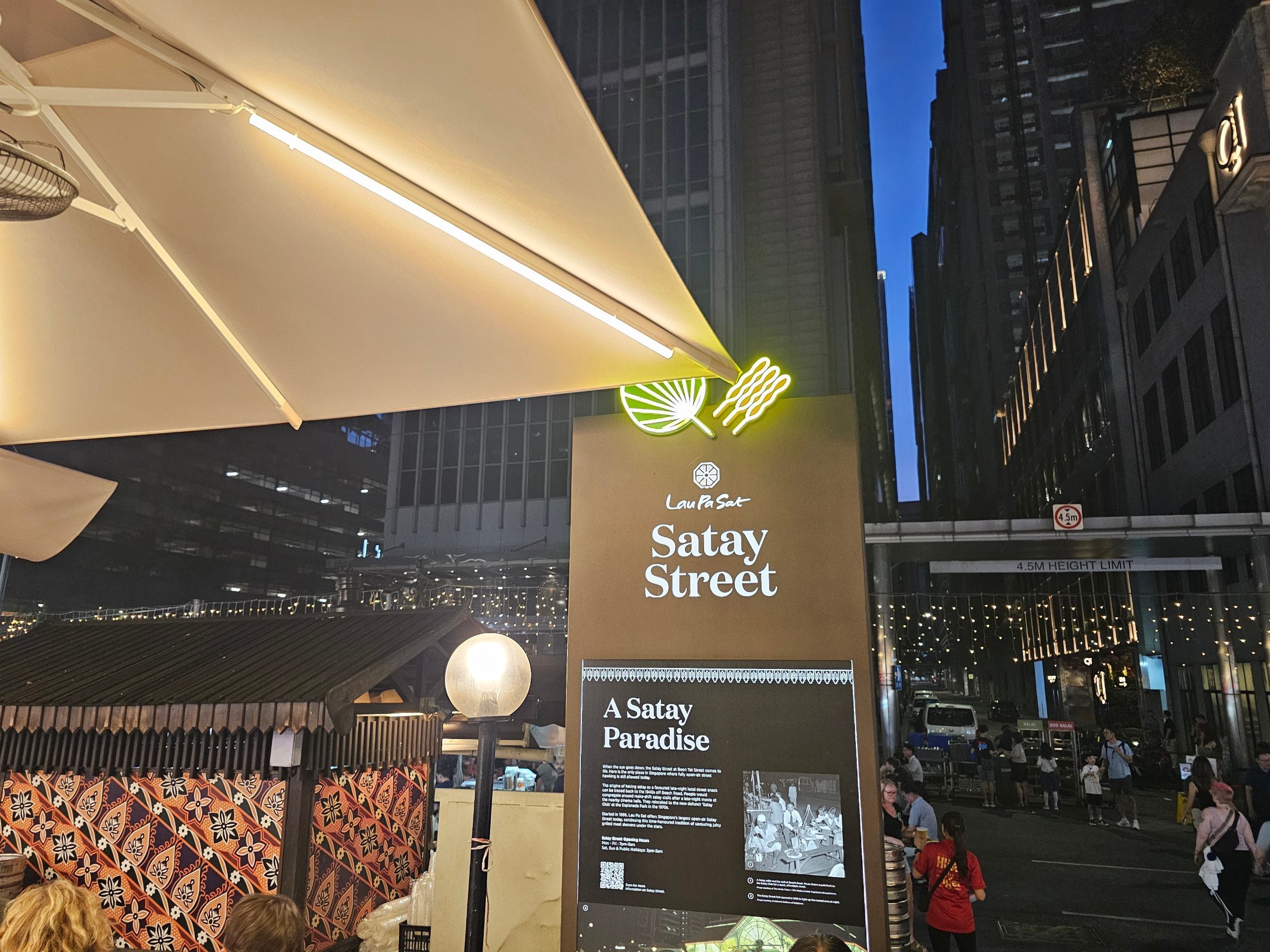 Pero por la noche, el ambiente cambia por completo: la calle frente al edificio se cierra, creando la famosa Satay Street, donde se asan docenas de brochetas y todo el lugar parece un gran festival de comida callejera al aire libre.