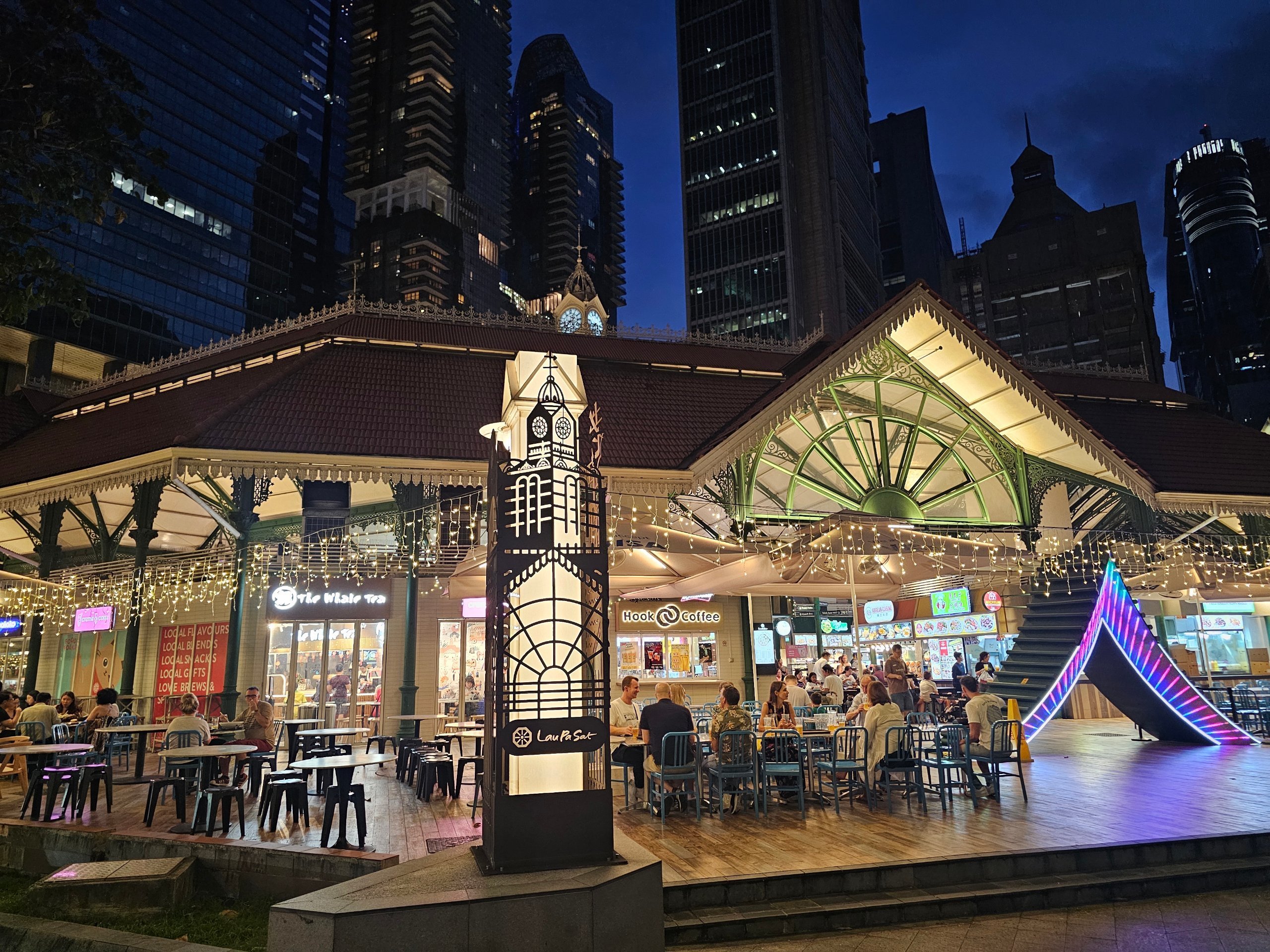 El ambiente es completamente distinto al del interior del mercado: el olor a carne asada, el humo de las parrillas y la bulliciosa vida nocturna crean una de las experiencias gastronómicas callejeras más emblemáticas de Singapur.
