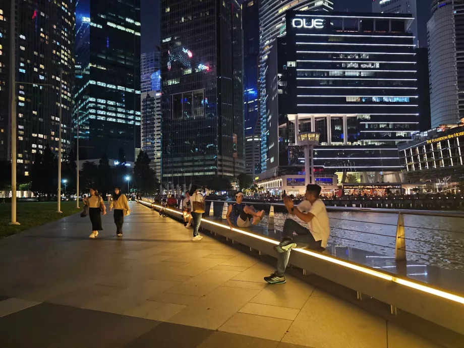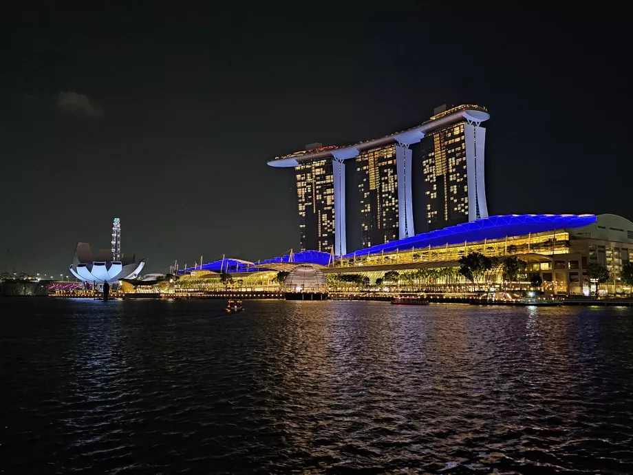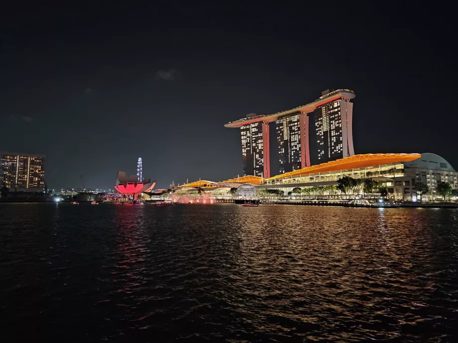 Su belleza se exhibe especialmente en la iluminación nocturna de los rascacielos, el hotel Marina Bay Sands, que cuenta con una piscina mundialmente famosa en su azotea, una noria y estatuas de leones a lo largo de la bahía.