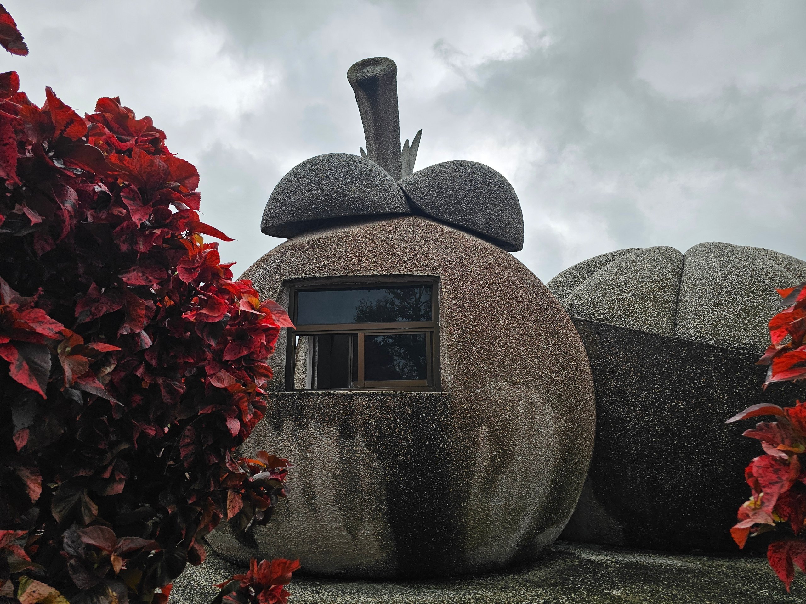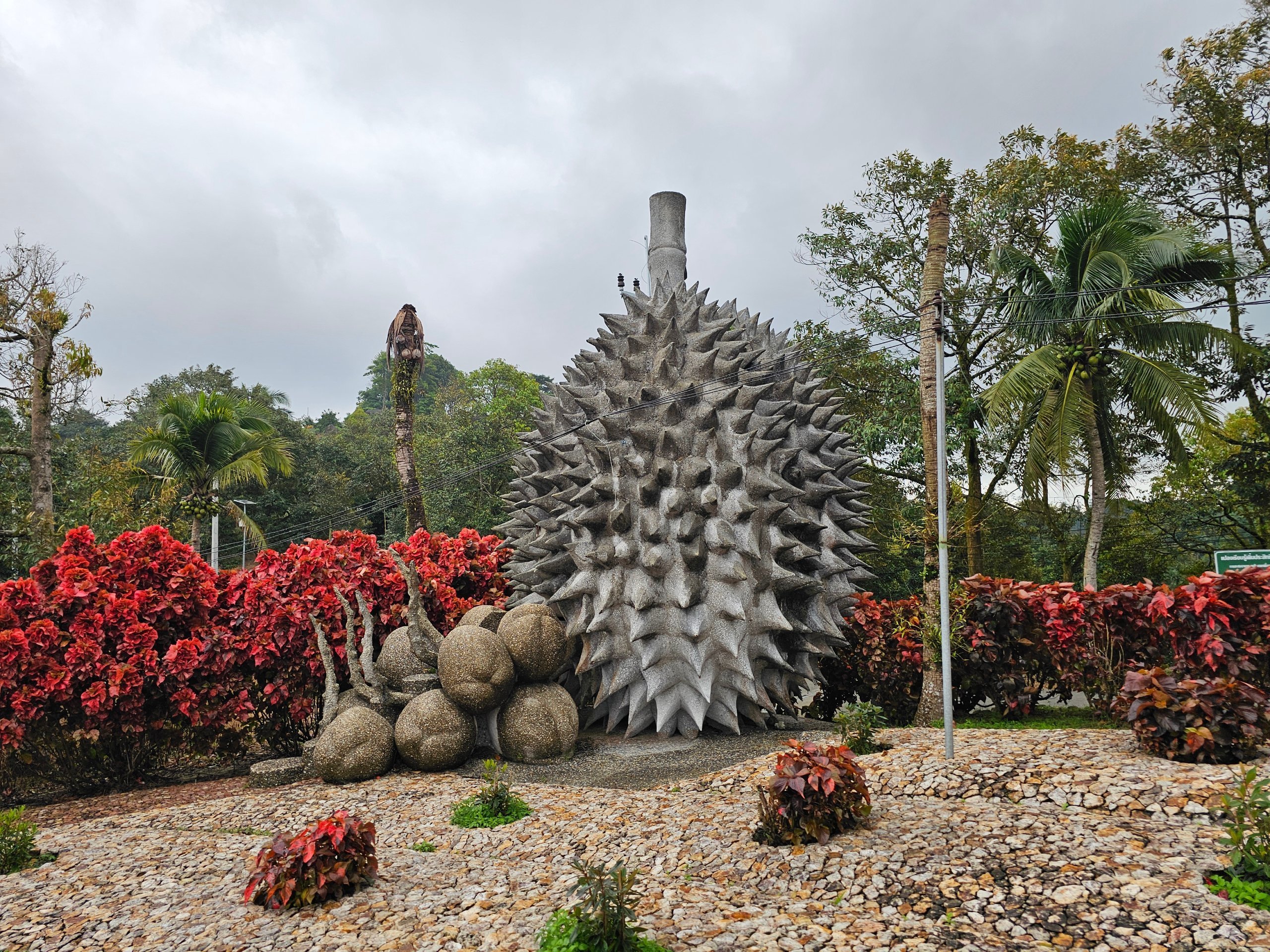Al borde de la carretera encontrarás una colección de "frutas" de hueso (durián, manzana, piña y otras) que parecen un extraño jardín sin un contexto claro.