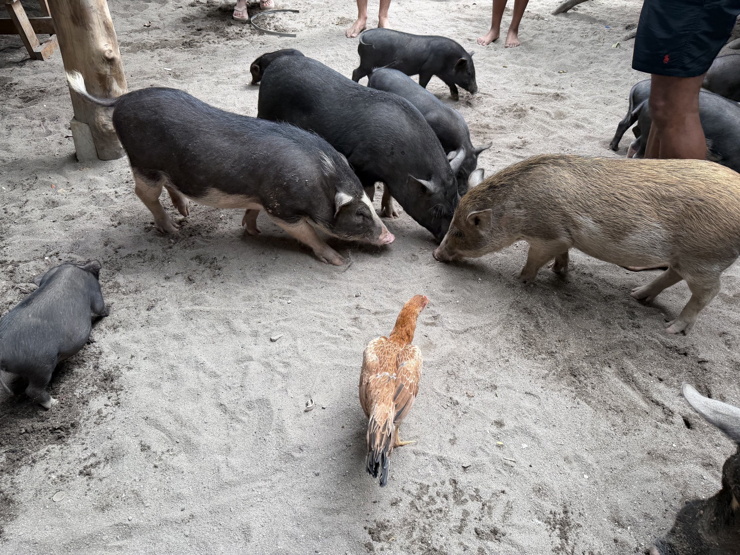 No son agresivos. Corren entre los turistas que les dan de comer grano (se puede comprar allí mismo) o les rascan el lomo. A menudo se limitan a tumbarse a la sombra o a vadear la orilla. Los turistas las rodean con sus teléfonos. Es una escena un tanto extraña: un paraíso tropical y un cerdo de mascota a tu lado en la playa.