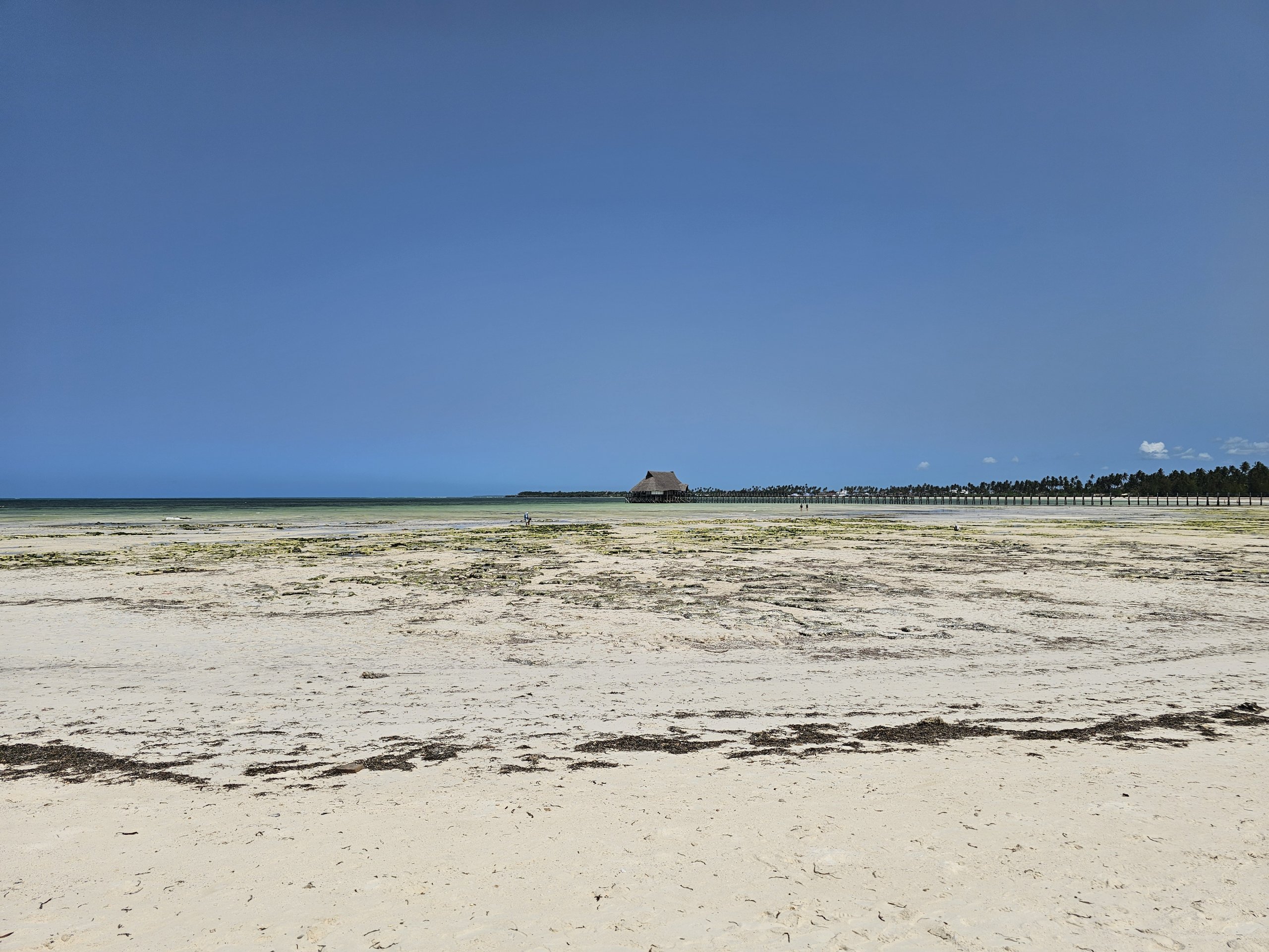 En medio de la playa hay un largo muelle con un bar al final.