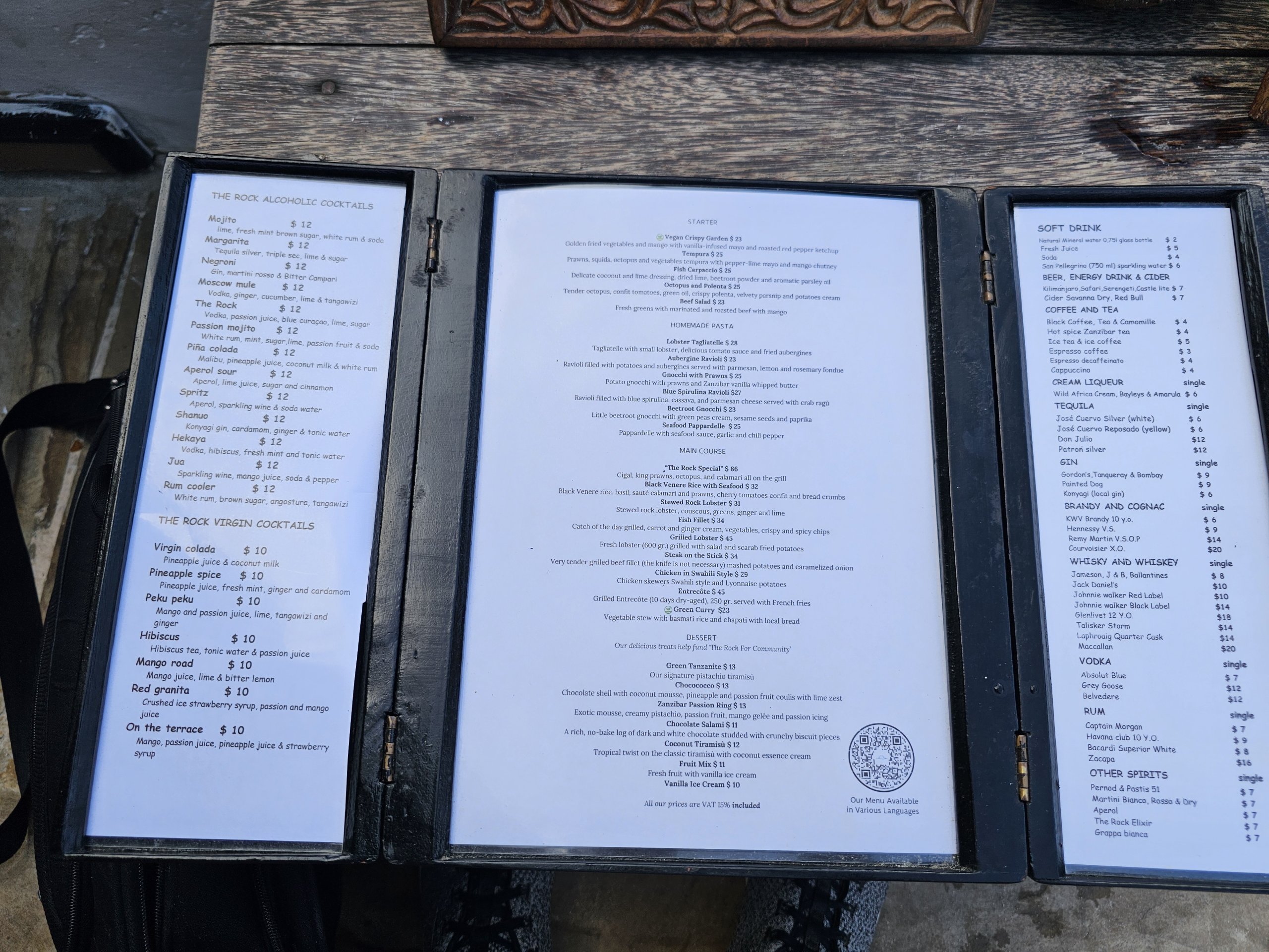 Se puede consultar el menú completo en el sitio web del restaurante: therockrestaurantzanzibar.com.