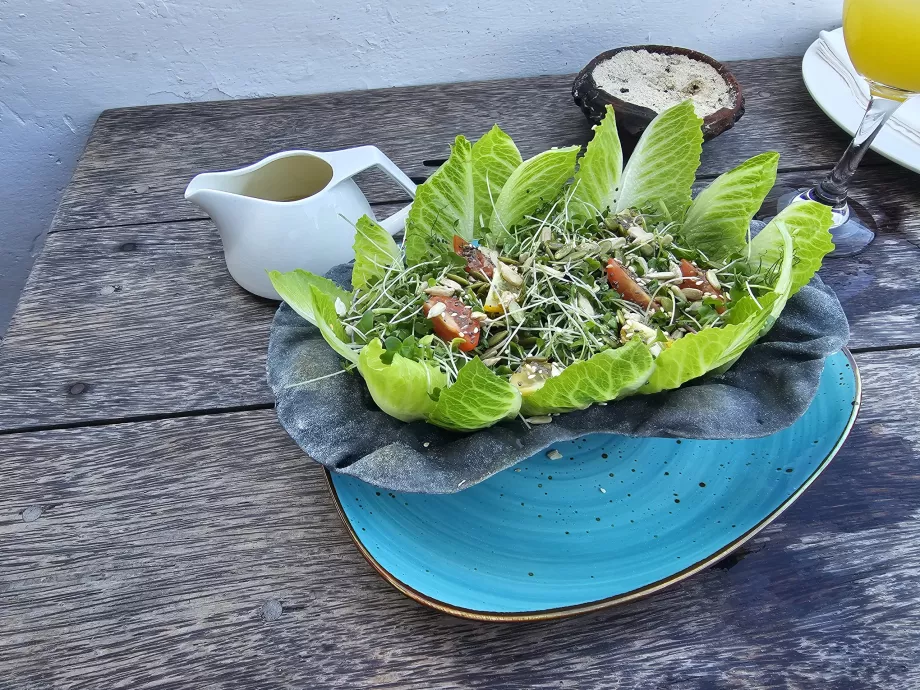 Como aperitivo, elegí una ensalada local de autor con semillas de sésamo y pan. Estaba buenísima.