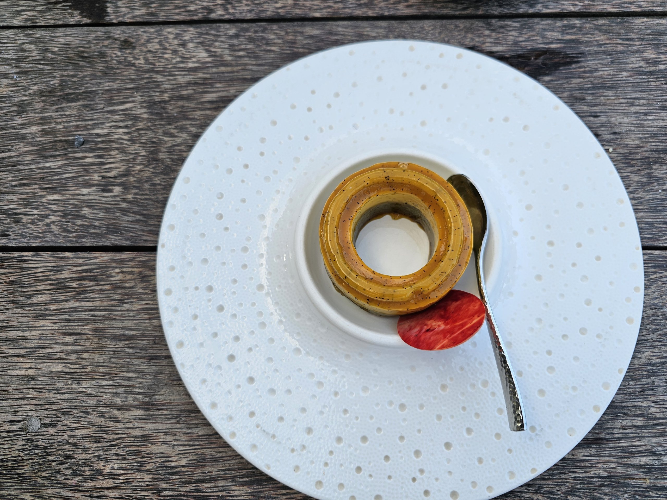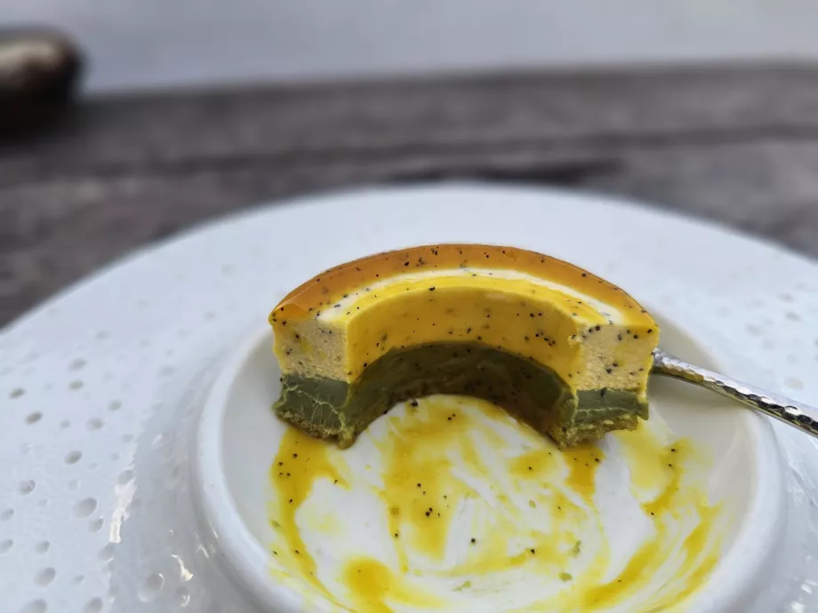 Pero lo mejor fue sin duda el postre. Probablemente uno de los mejores que he probado en mi vida. Lo encontrarás en el menú bajo el nombre Zanzibar Passion Ring tarta de crema de maracuyá y pistacho. Brillante.