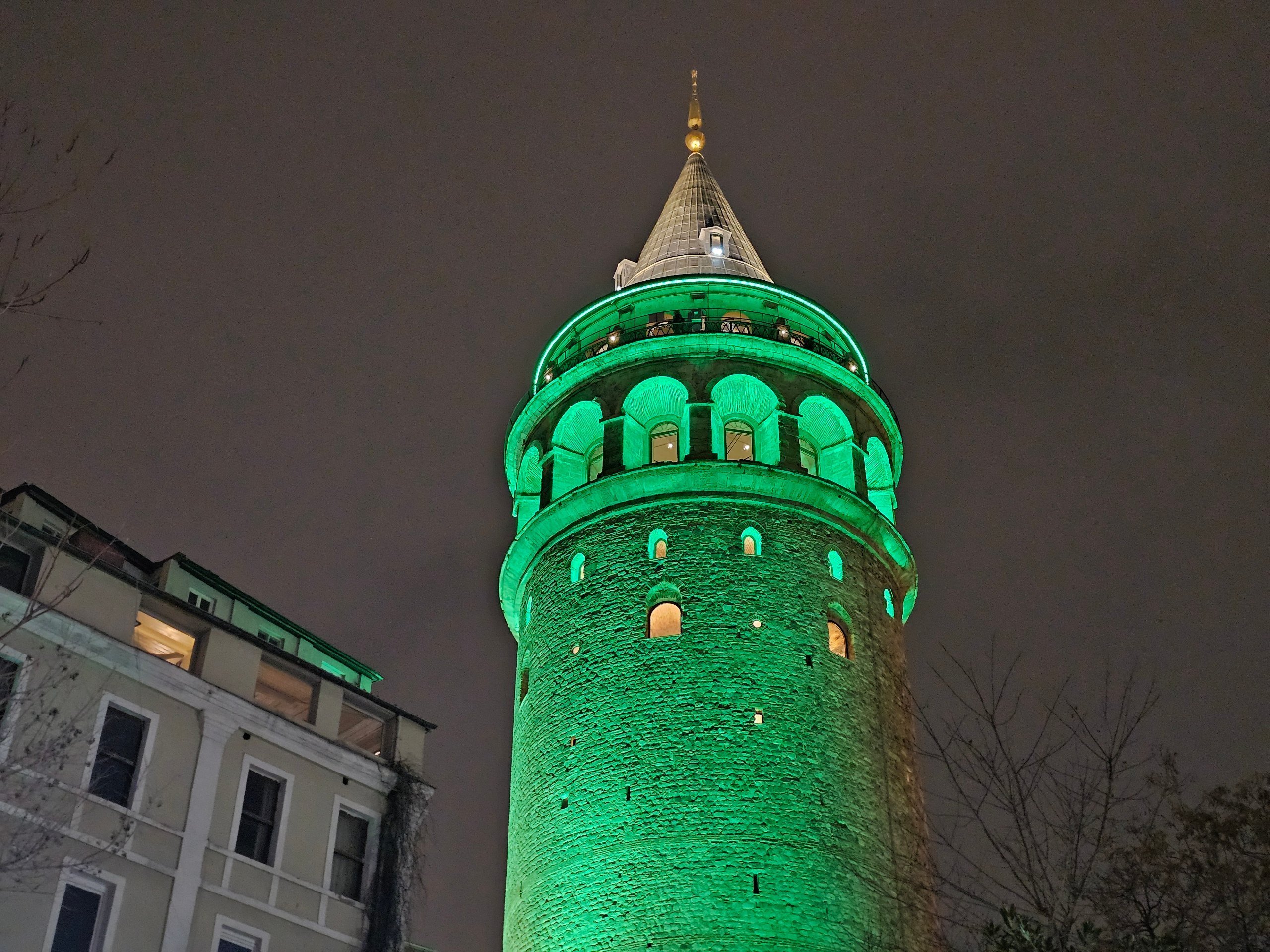 Por la noche, la Torre Gálata se ilumina con luces verdes.
