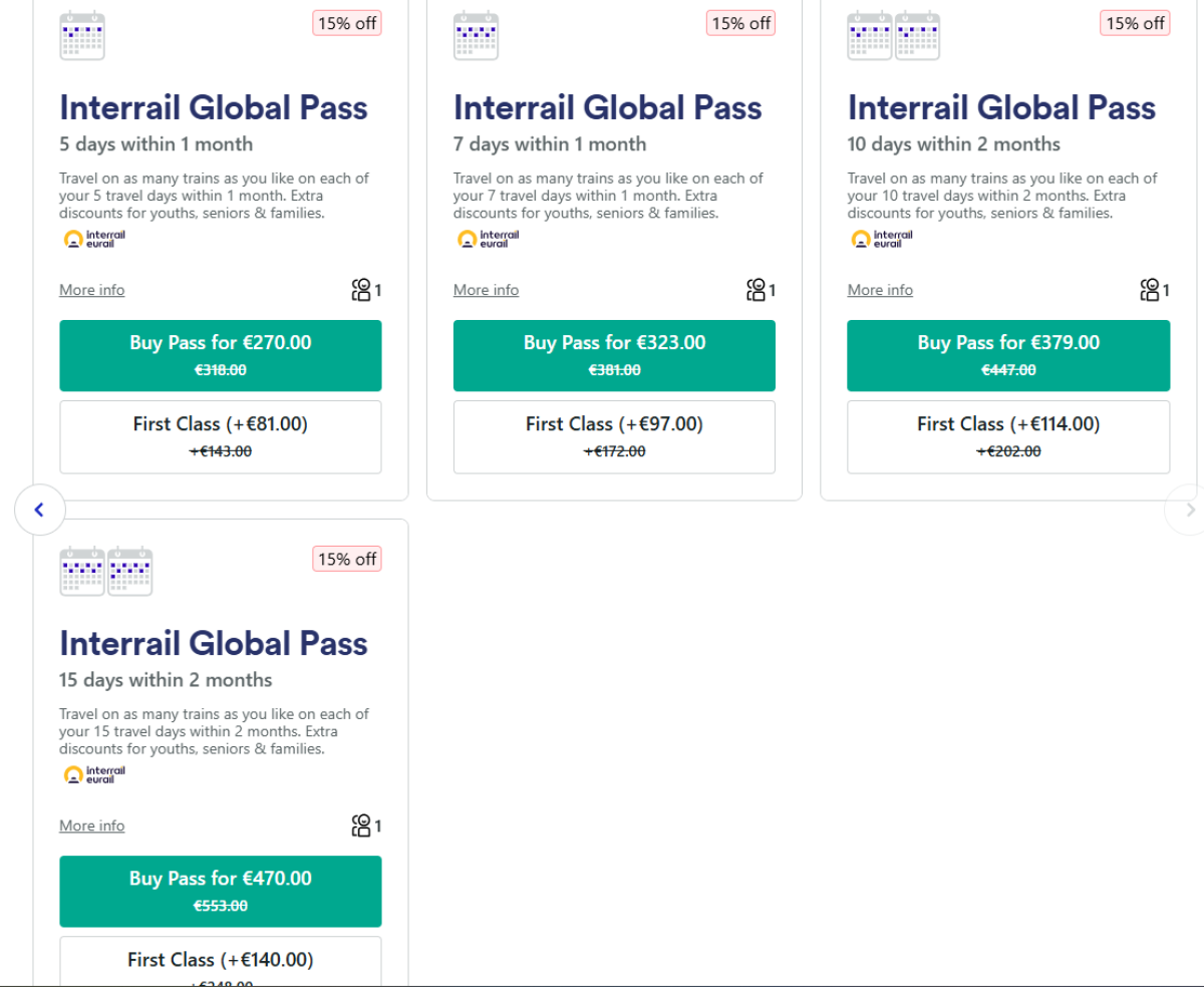 El descuento del 15% se aplica a todos los tipos de pases, que puede comparar en thetrainline.com. Personalmente, me interesaron más las siguientes ofertas: