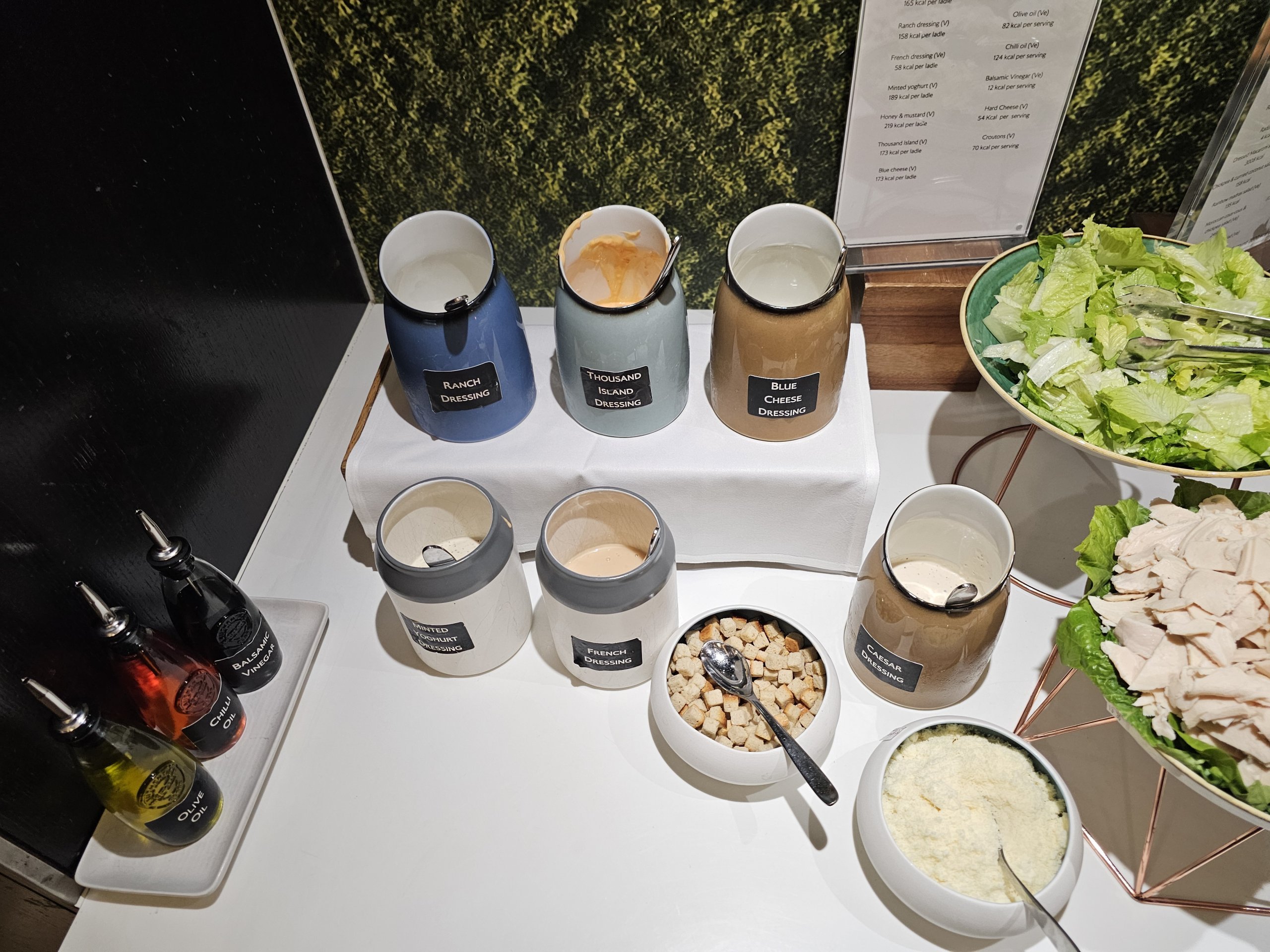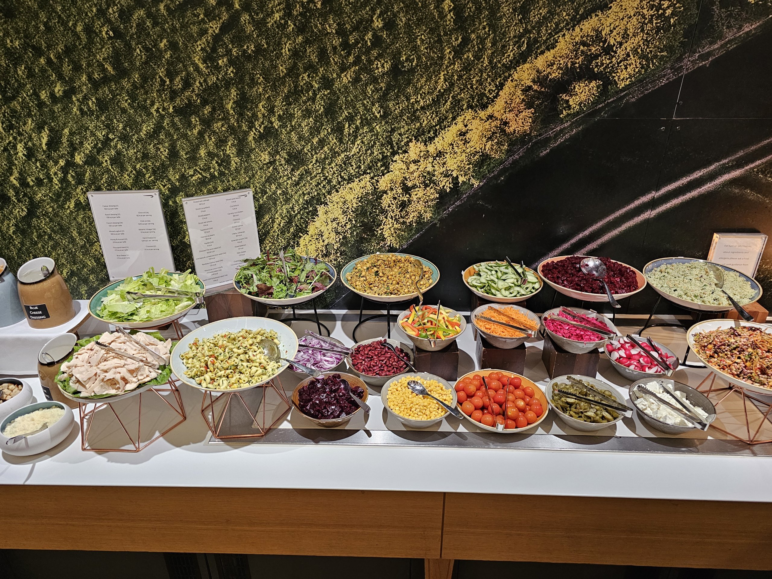 El menú de comida fría incluye algunas verduras, una ensalada con diferentes aliños a elegir y una selección muy limitada y débil de bollería (prácticamente sólo dulce).