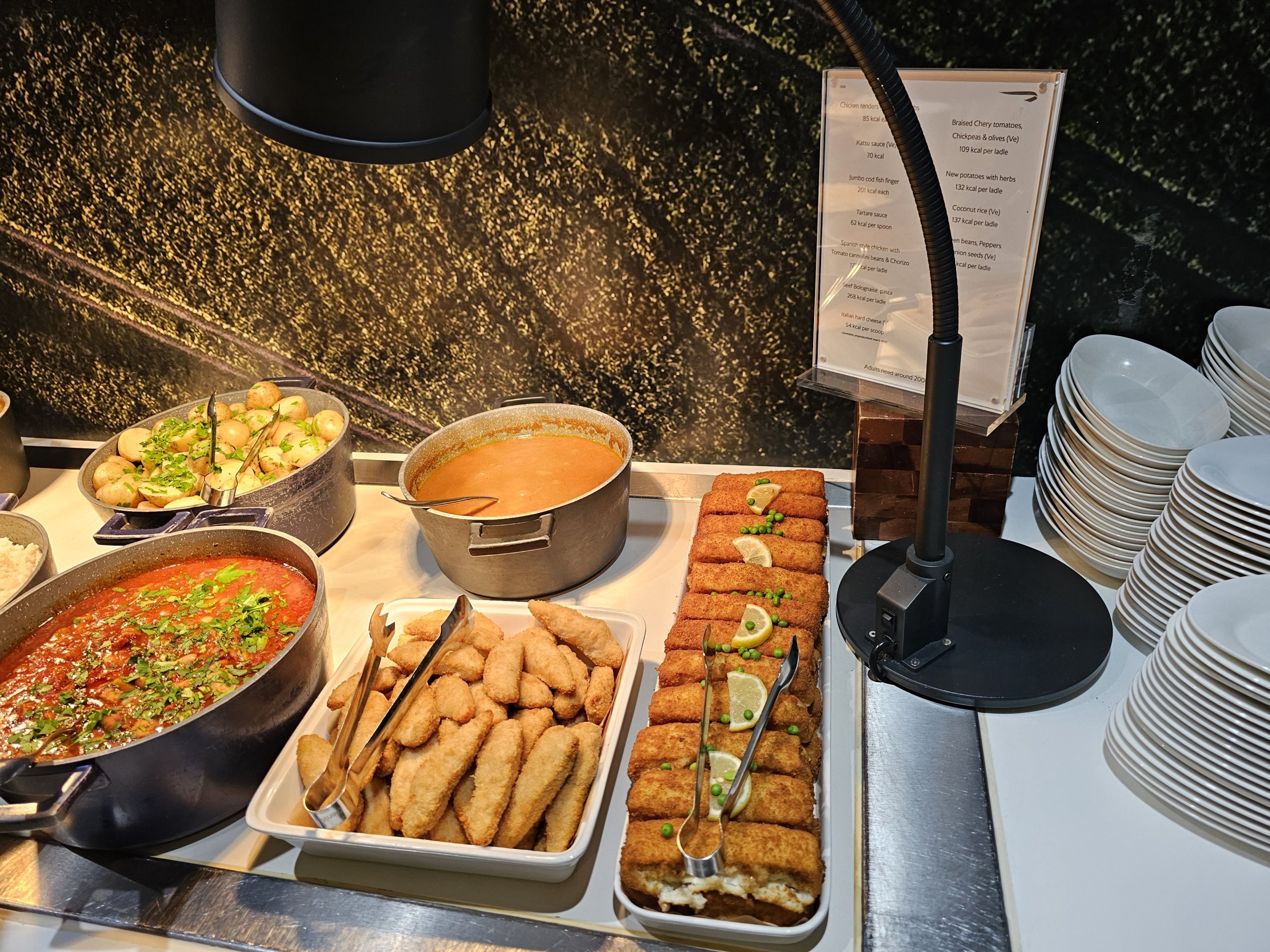 La comida caliente tiene un menú de desayuno (hasta las 11:30 aproximadamente) y un menú de almuerzo (hasta la hora de cierre de la sala VIP). La sopa está disponible durante todo el día.