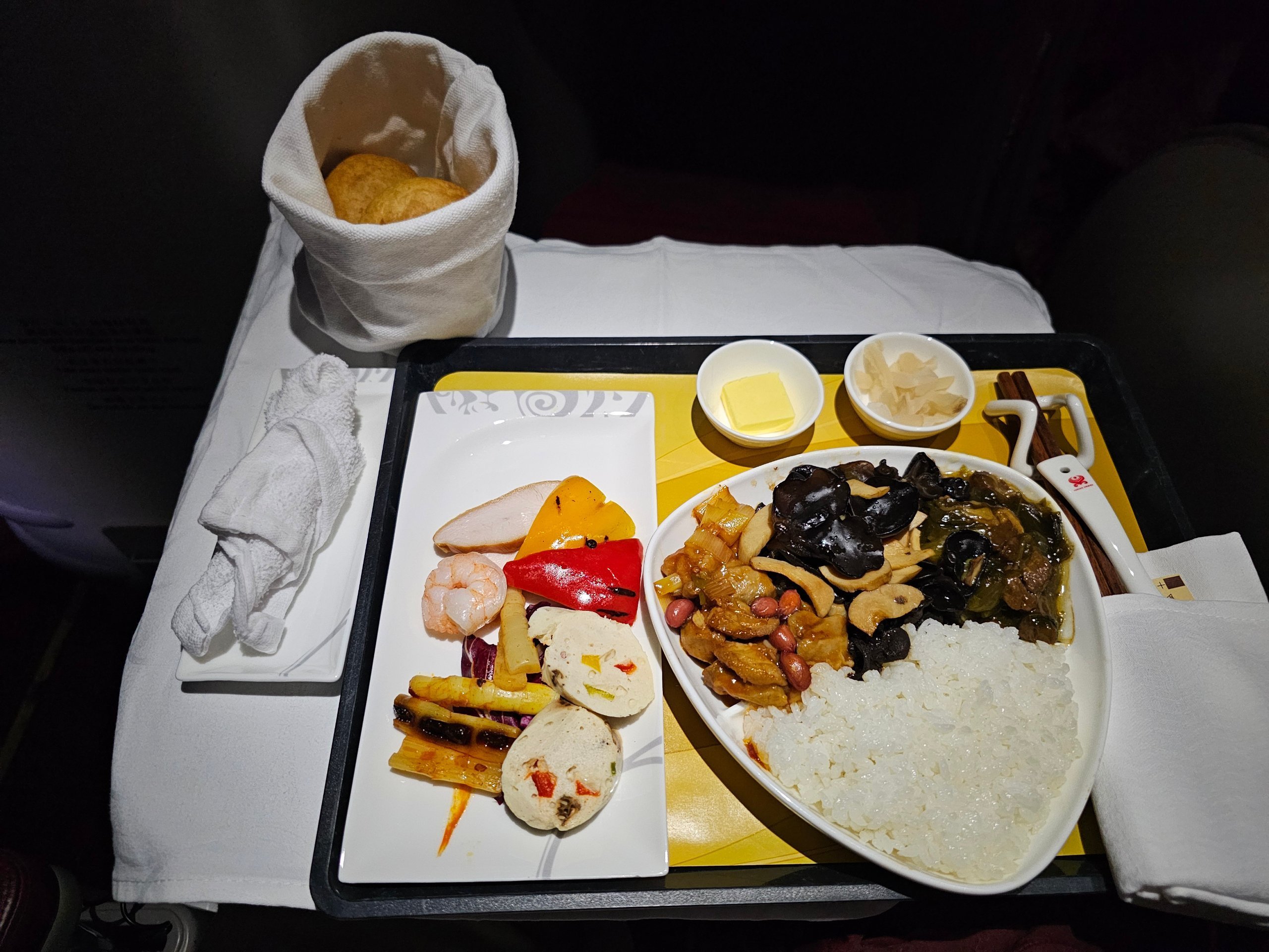 Después del despegue, sigue la comida principal, que es similar en sabor a lo que hemos experimentado en el segmento anterior - más estilo chino, presentación menos distintiva.