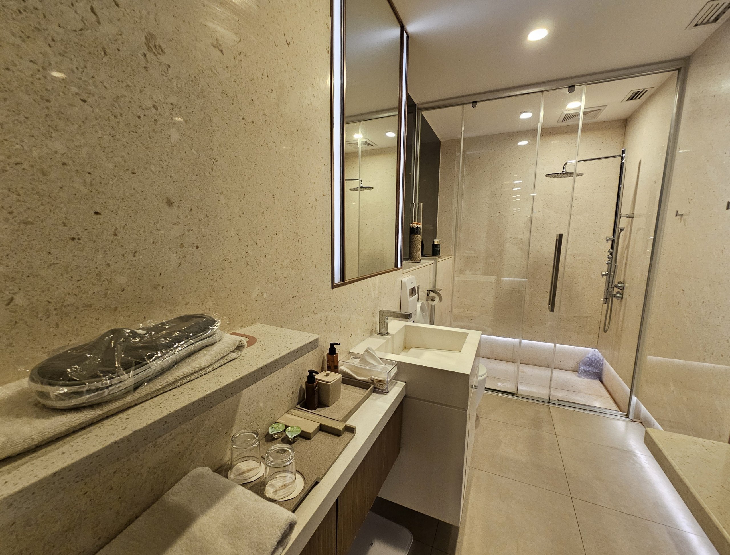 También dispone de una ducha espaciosa y limpia, algo que yo personalmente agradezco especialmente entre vuelos largos.