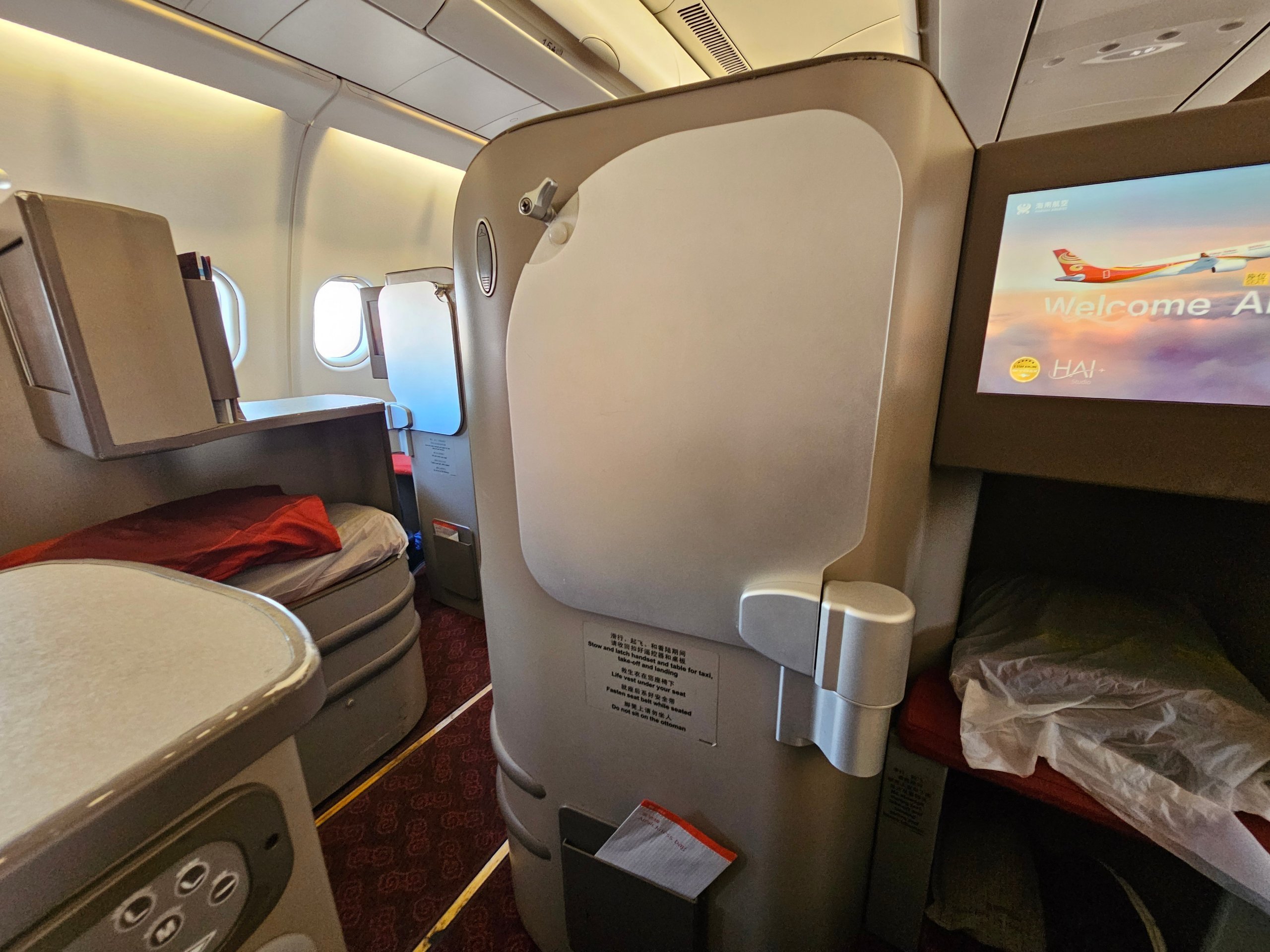 El Airbus A330-300 de Hainan Airlines en configuración Stelia Solstys ofrece una cama totalmente plana y un sólido confort. Sin embargo, en comparación con el primer segmento con salida de Praga, la intimidad es más débil y la sensación general menos premium.