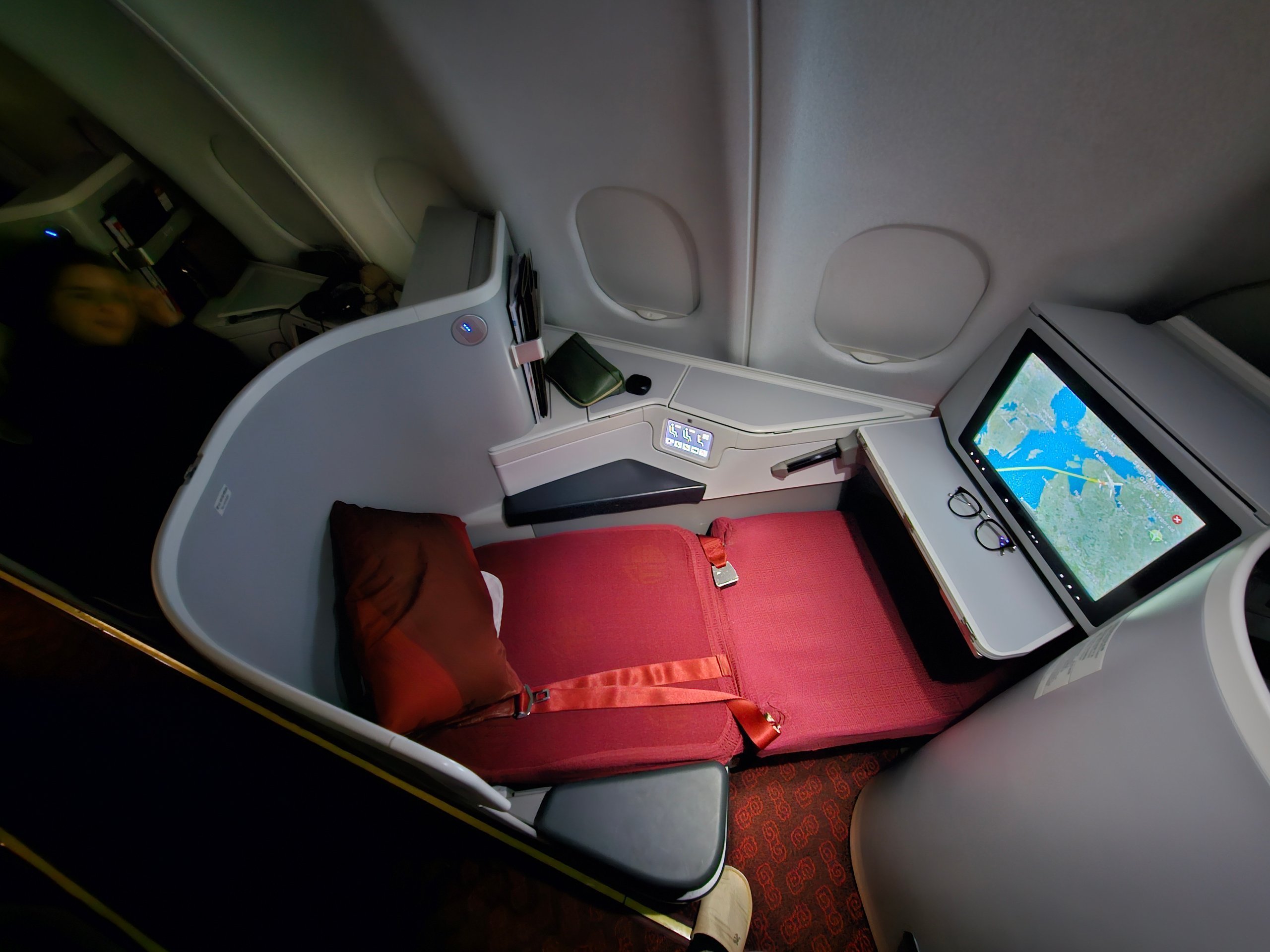 No hay mucho espacio para las piernas al tumbarse, pero la anchura del asiento y la separación entre pasillos son adecuadas. En ese sentido, la intimidad está bien. Prácticamente no veo a ningún pasajero cuando estoy tumbado.