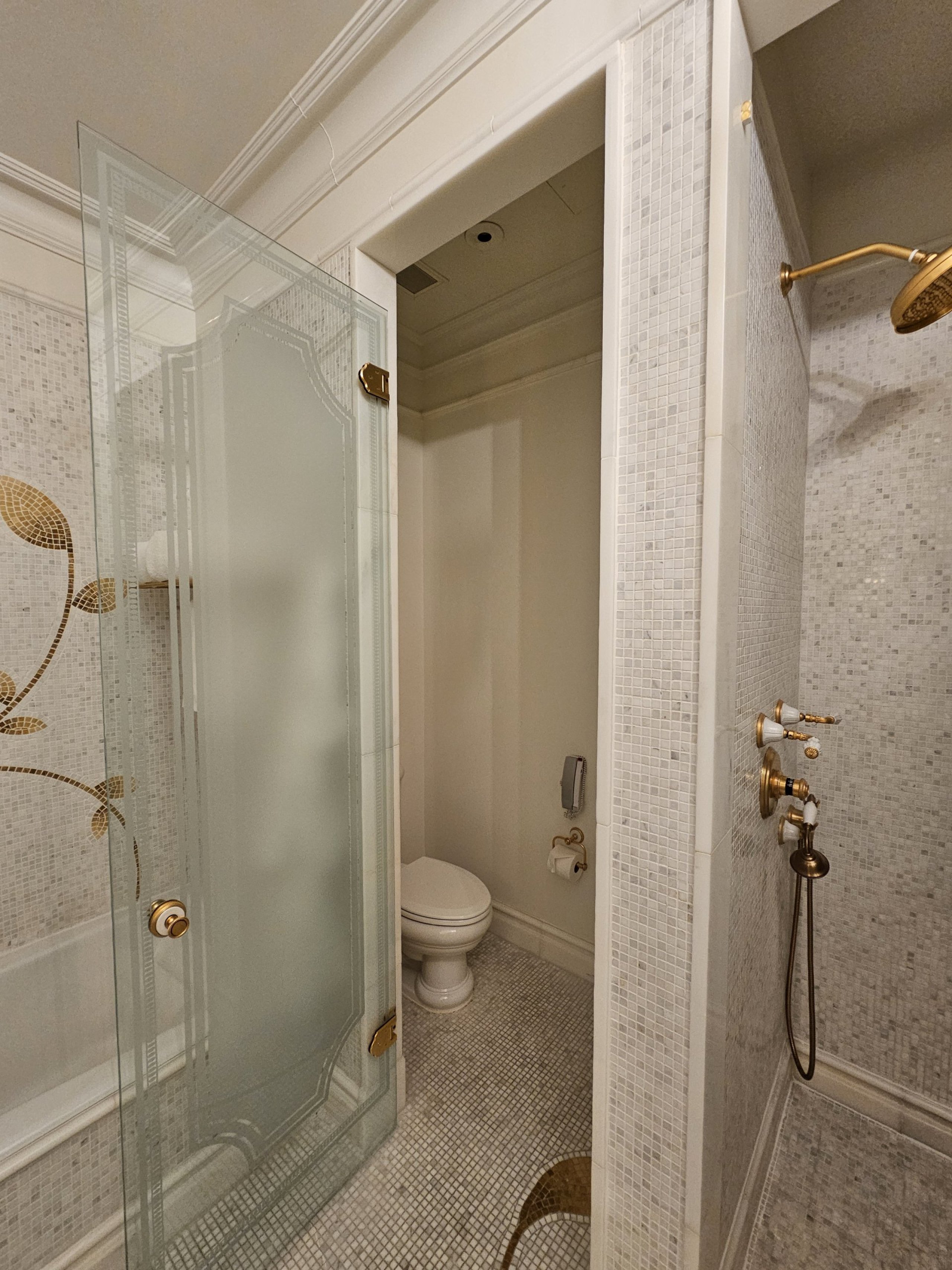 Aprecio el hermoso y muy amplio cuarto de baño con bañera, lavabo y dos habitaciones separadas para inodoro y ducha.