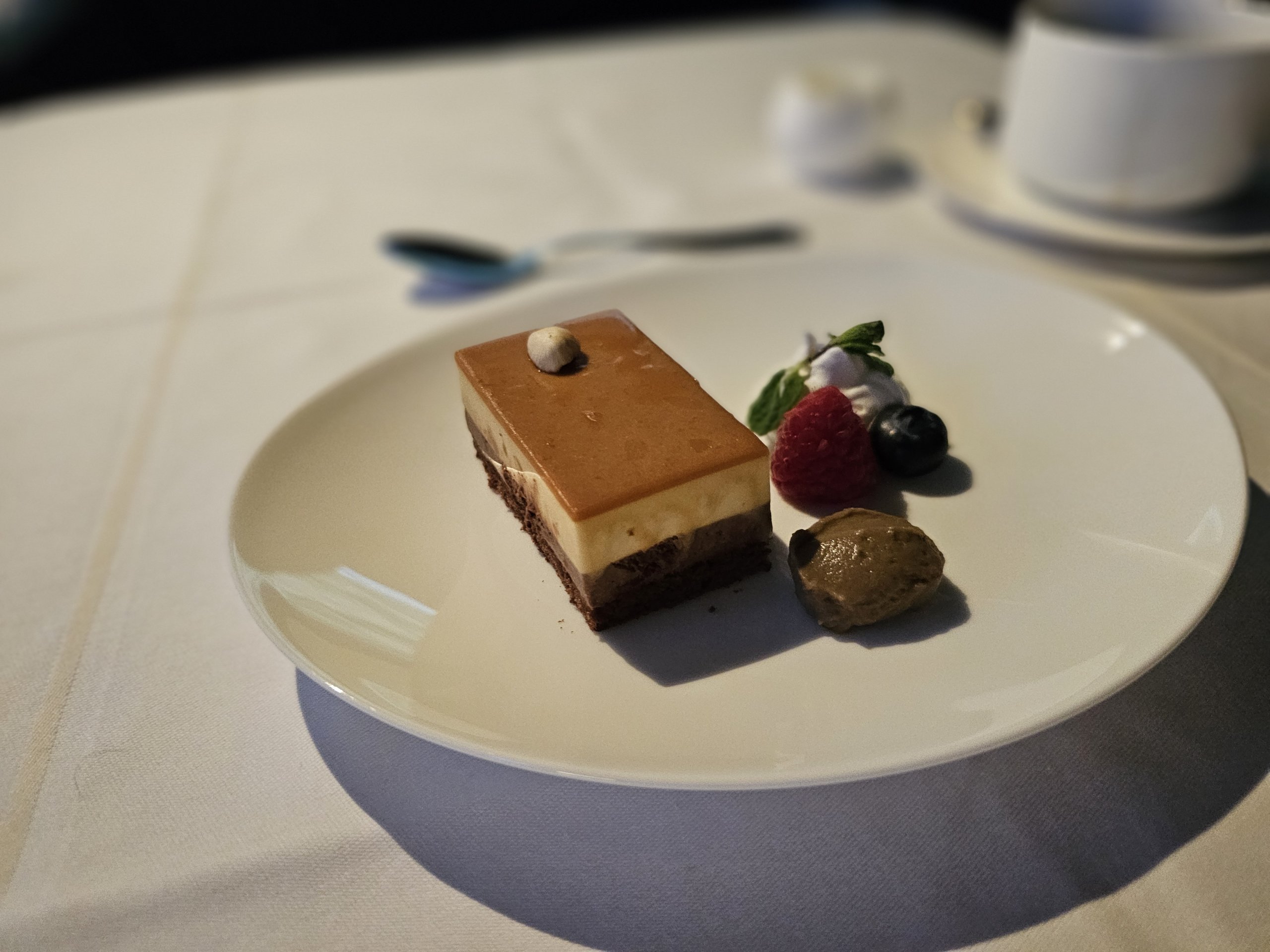 La tarta de chocolate y caramelo no impresiona, pero tampoco ofende. Una buena elección.