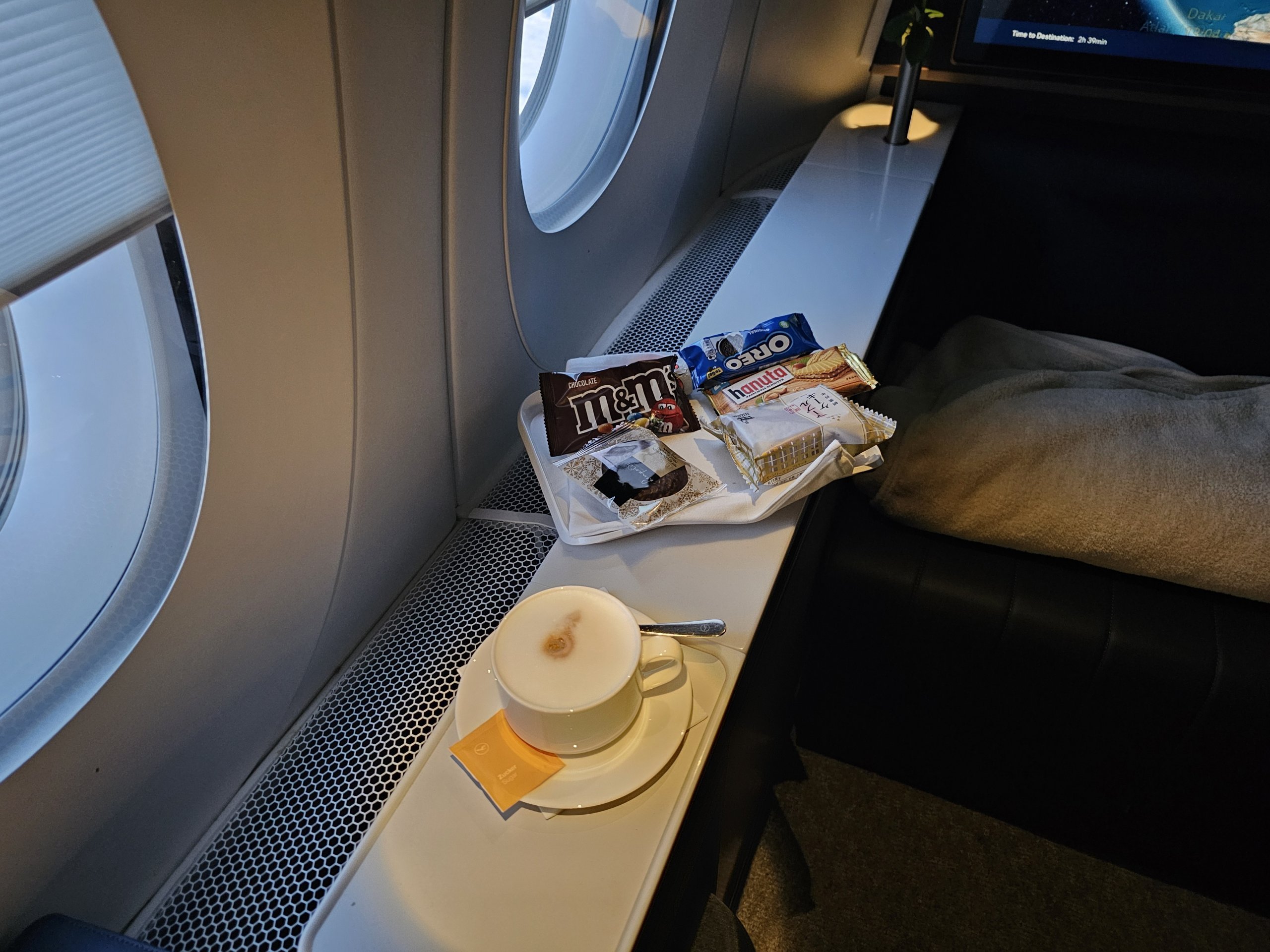 Antes de acostarme, la tripulación me ofrece una cesta de dulces y galletas saladas, disponibles en la cocina durante todo el vuelo.