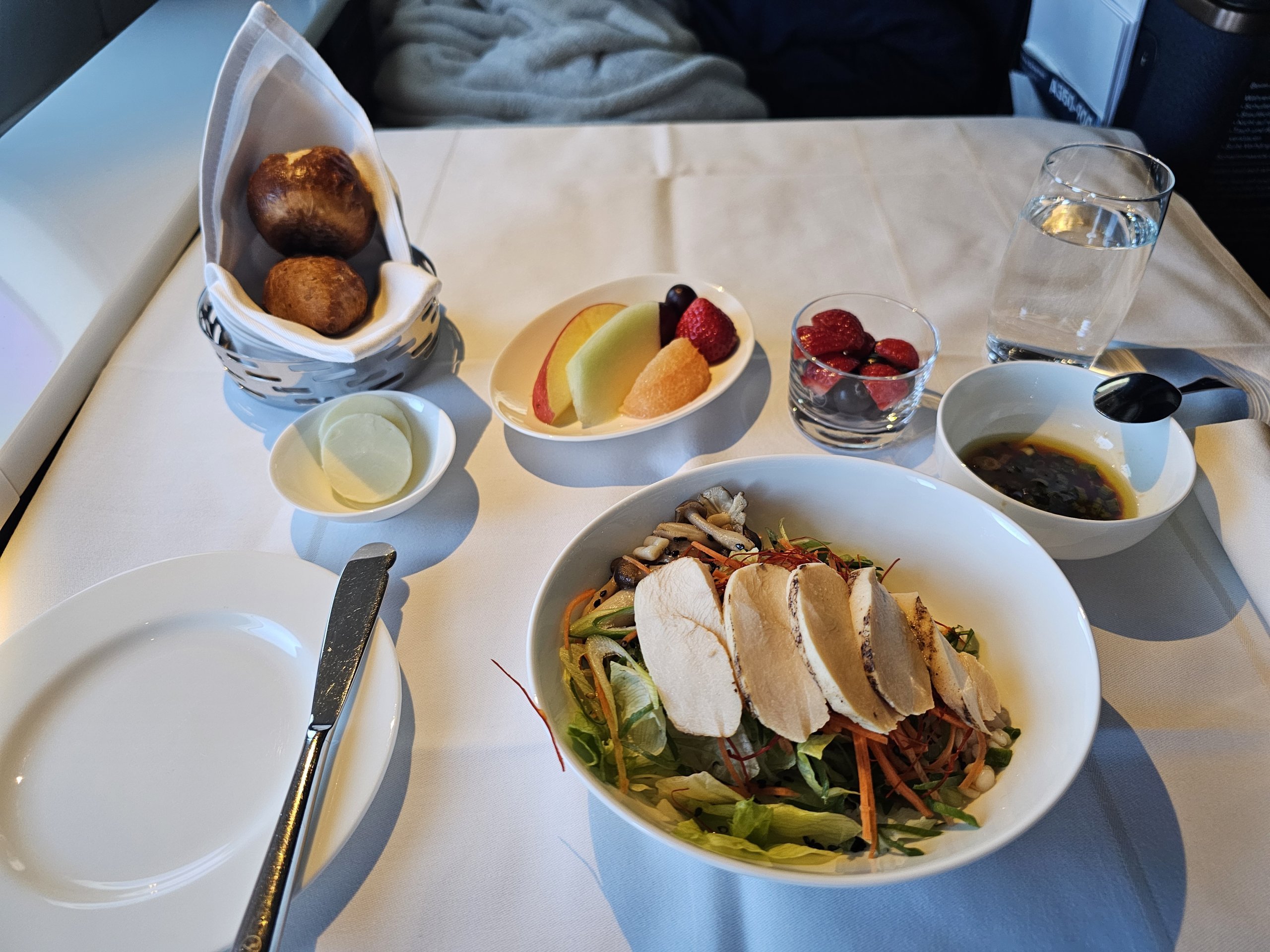 El aperitivo es muy fresco, colorido, ligero y estupendo. Me gusta la presentación y, en comparación con el servicio de clase Business, la comida es más abundante y mucho más variada.