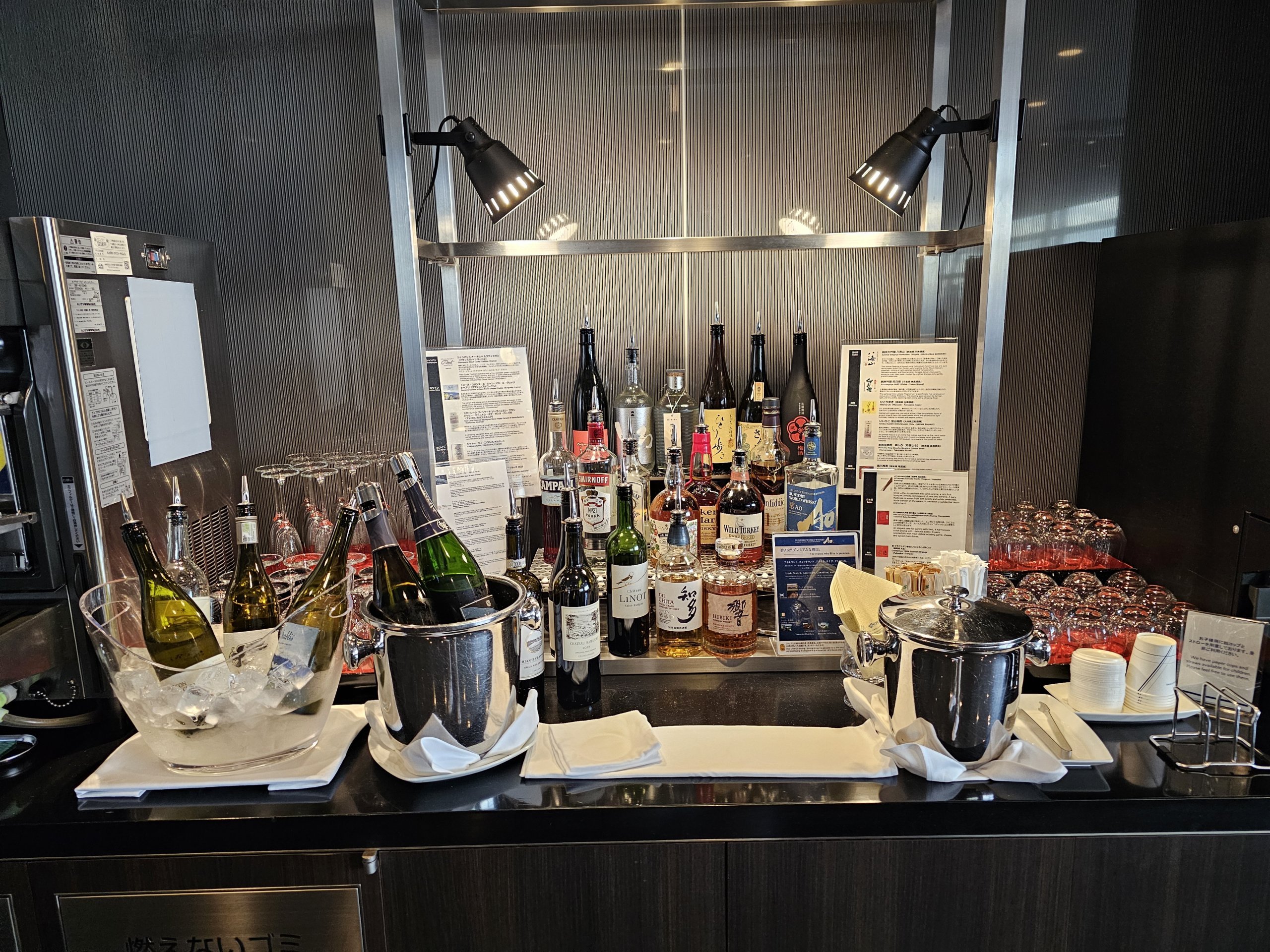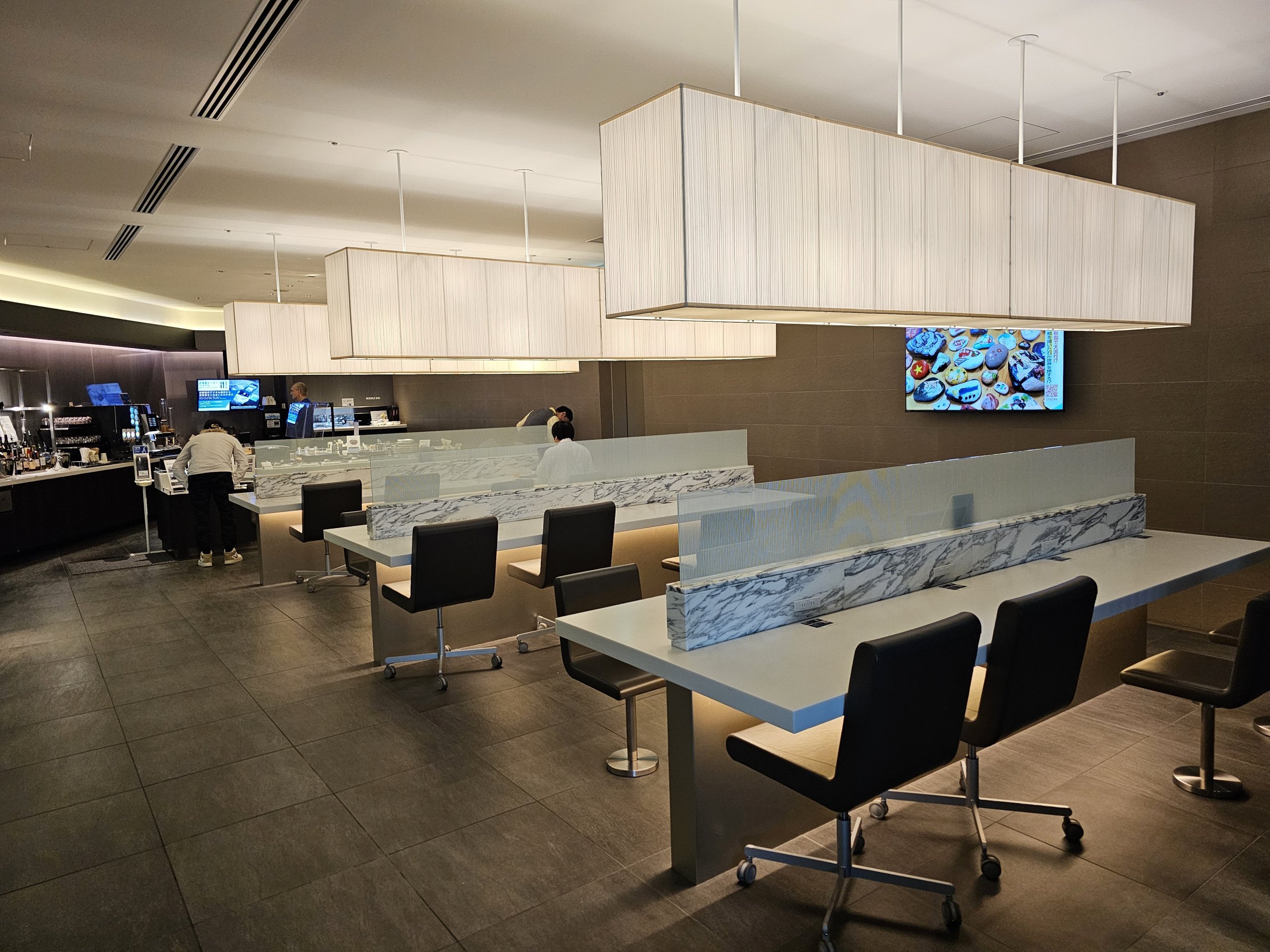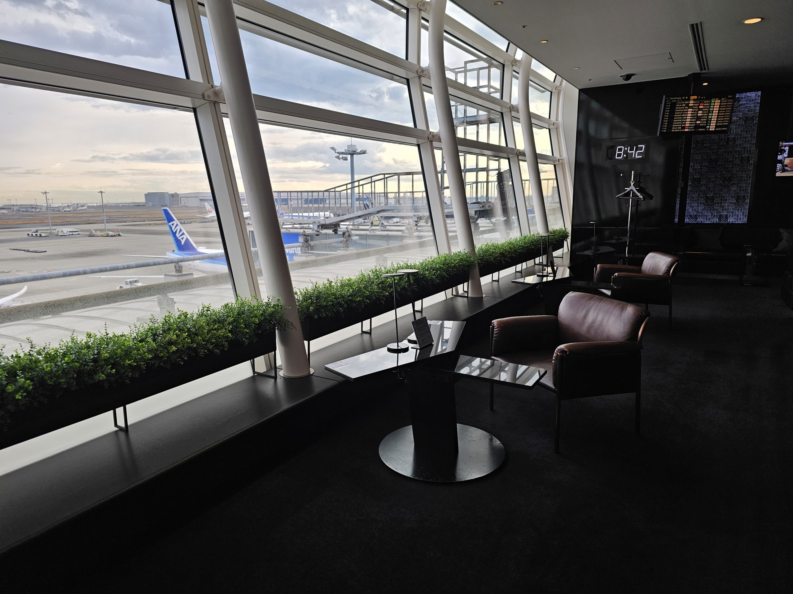La sala es muy espaciosa, con una gran vista de la pista y muchos cubículos que imitan los asientos de primera clase de ANA Japan Airlines.