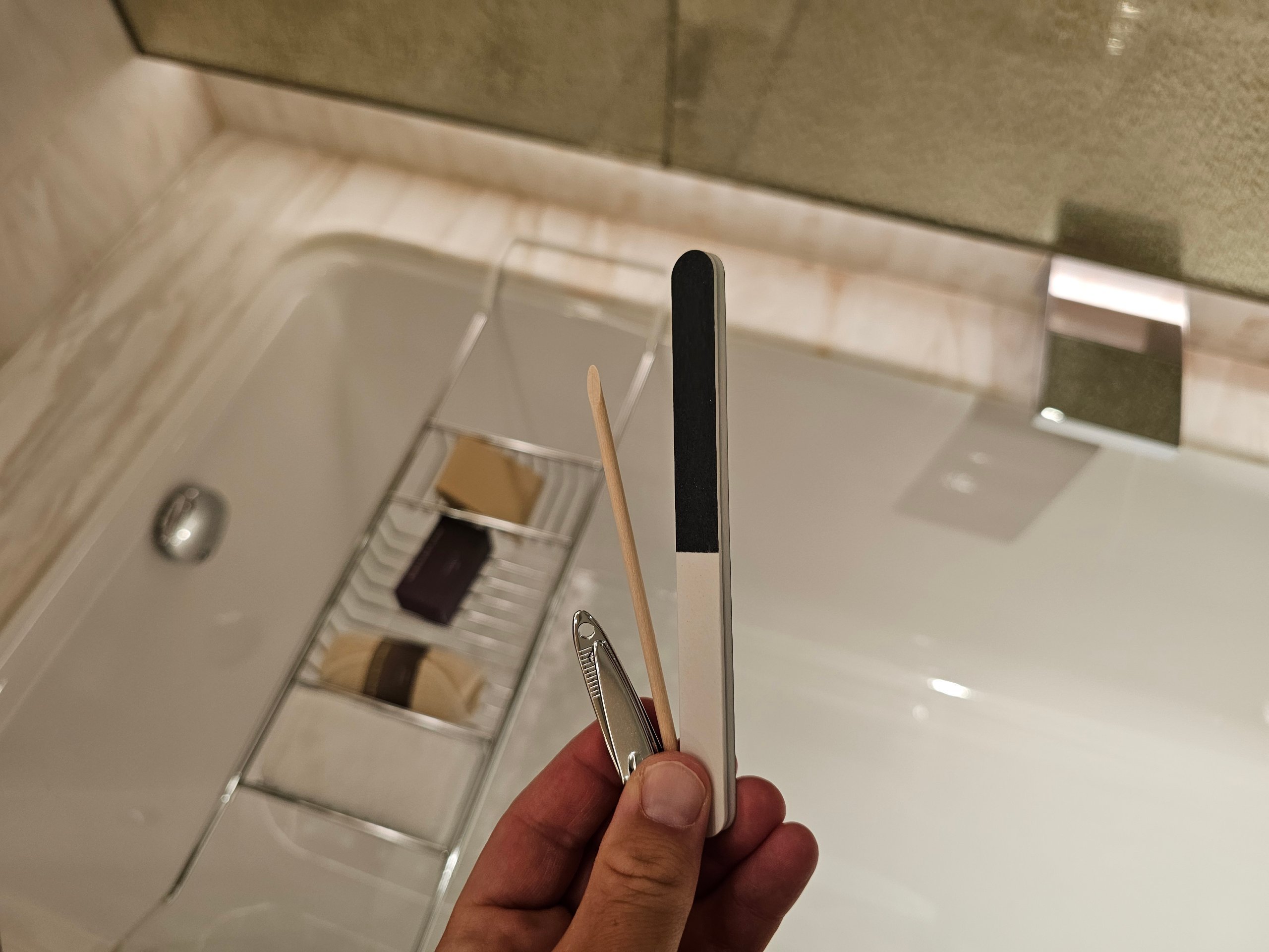 - rico kit de amenidades que incluye artículos de afeitado, una caja para aparatos ortopédicos o un pequeño kit de costura