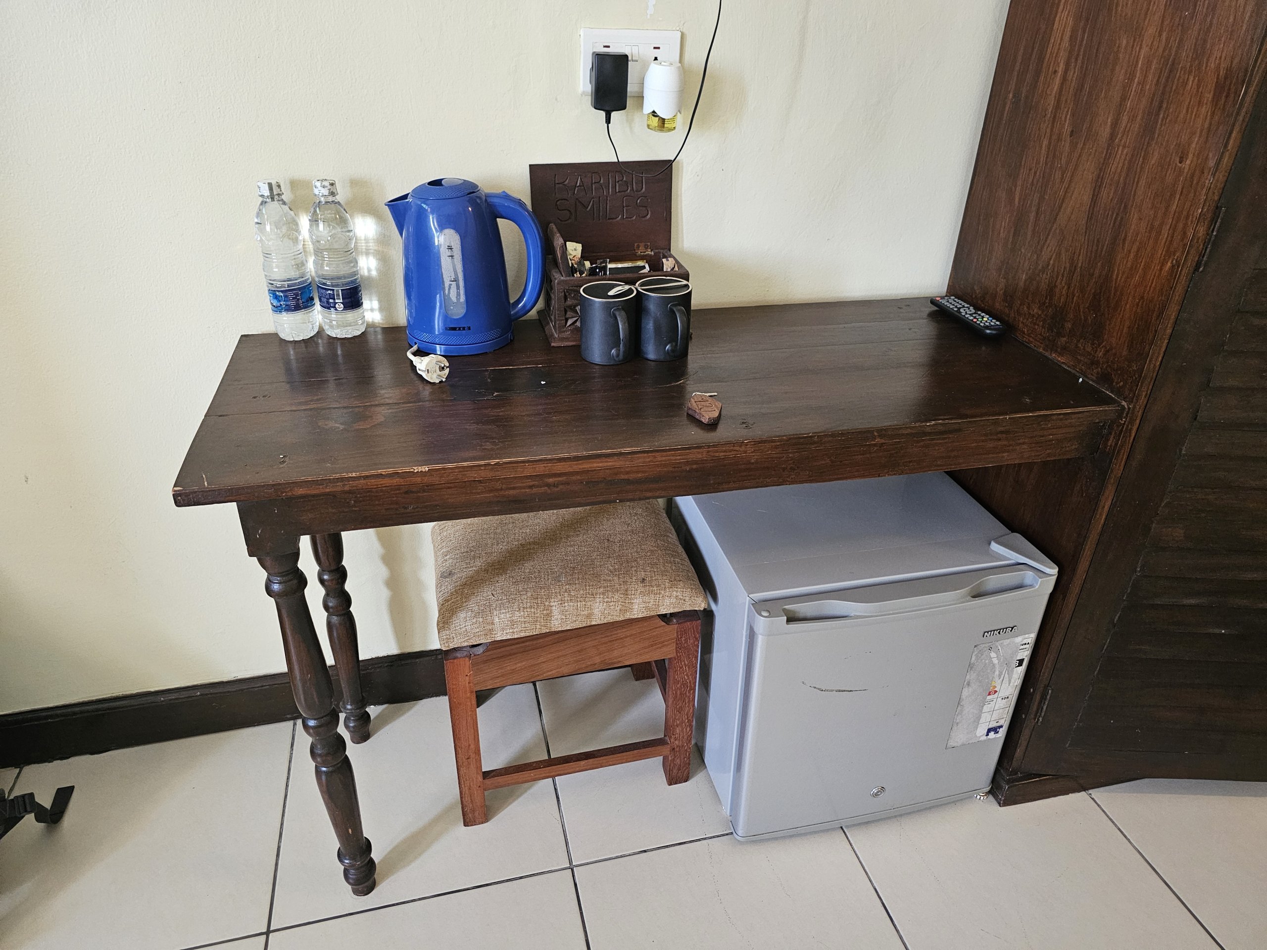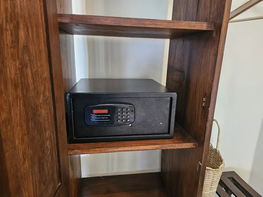 También en la habitación hay una caja fuerte, toalla de playa, hervidor de agua, café instantáneo y té.