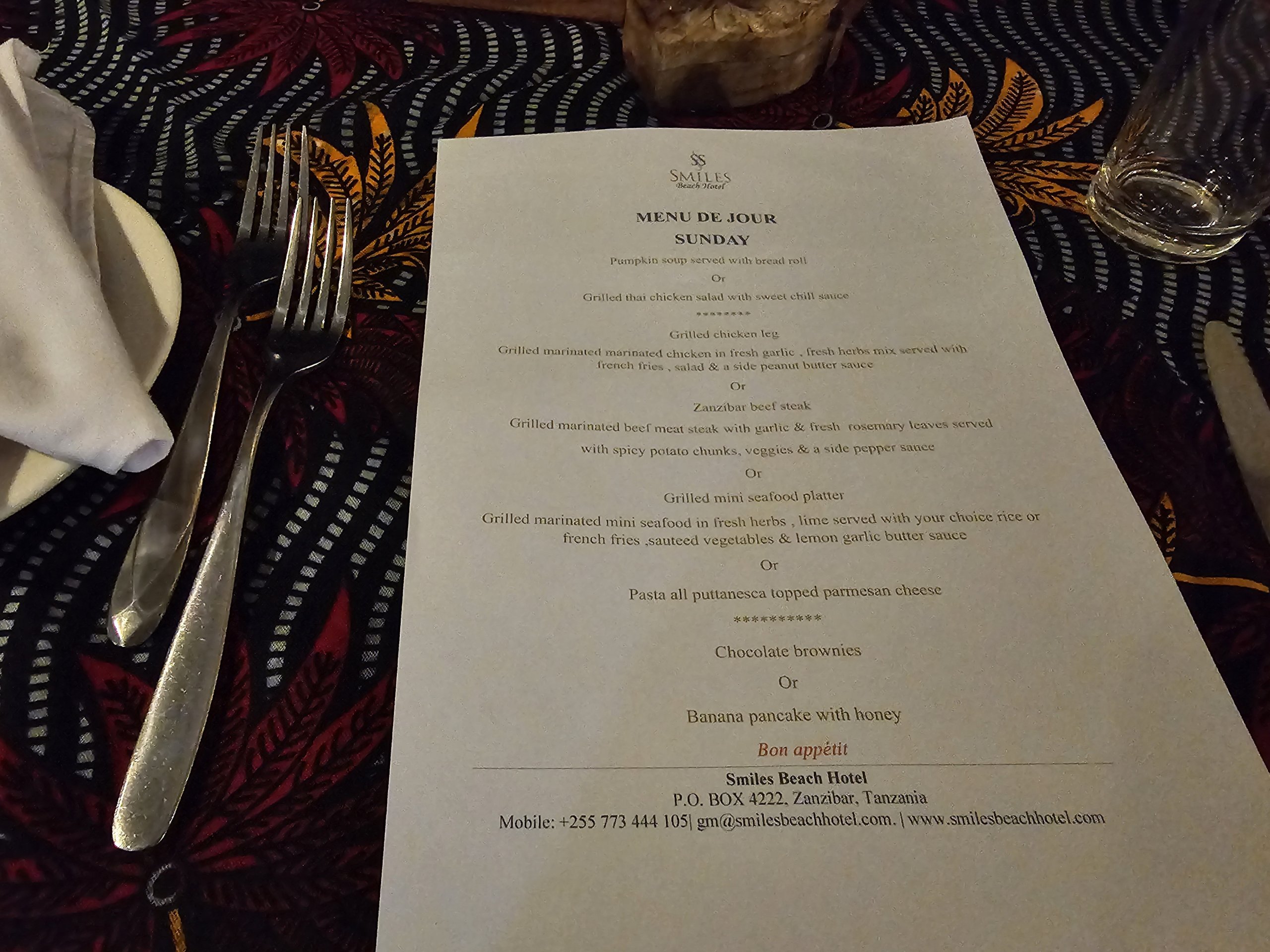 A primera vista, el menú es muy pobre, pero comparado con otros hoteles de la misma categoría en Zanzíbar, como el Sea View Lodge de Jambiani, adonde me trasladé desde Nungwi, en realidad está por encima de la media.