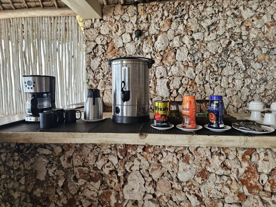 Se ofrece café de goteo sin filtrar, así como tés de bolsa.