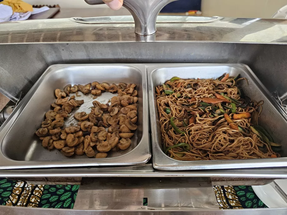 Hay tres tipos de comida caliente para elegir: principalmente fideos o arroz, salchichas de muy mala calidad, tortitas chapati u otros pasteles locales, verduras cocidas, alubias o setas.