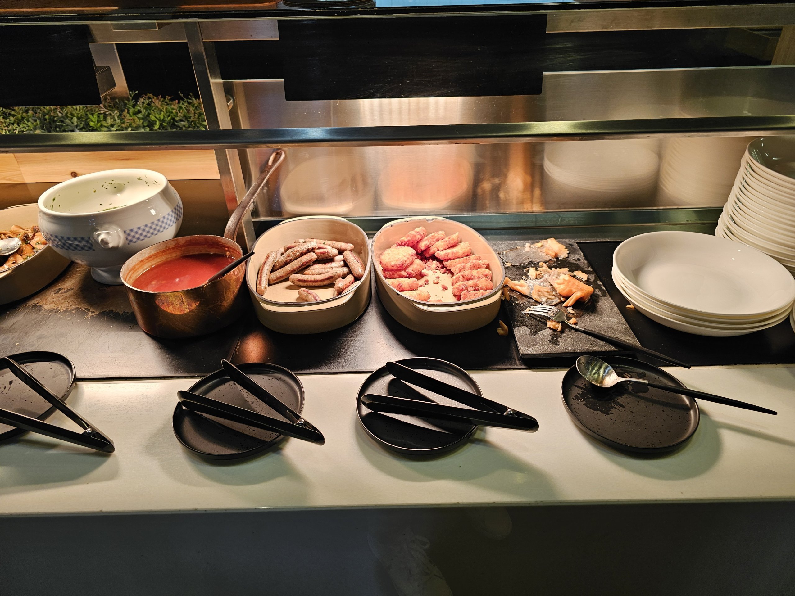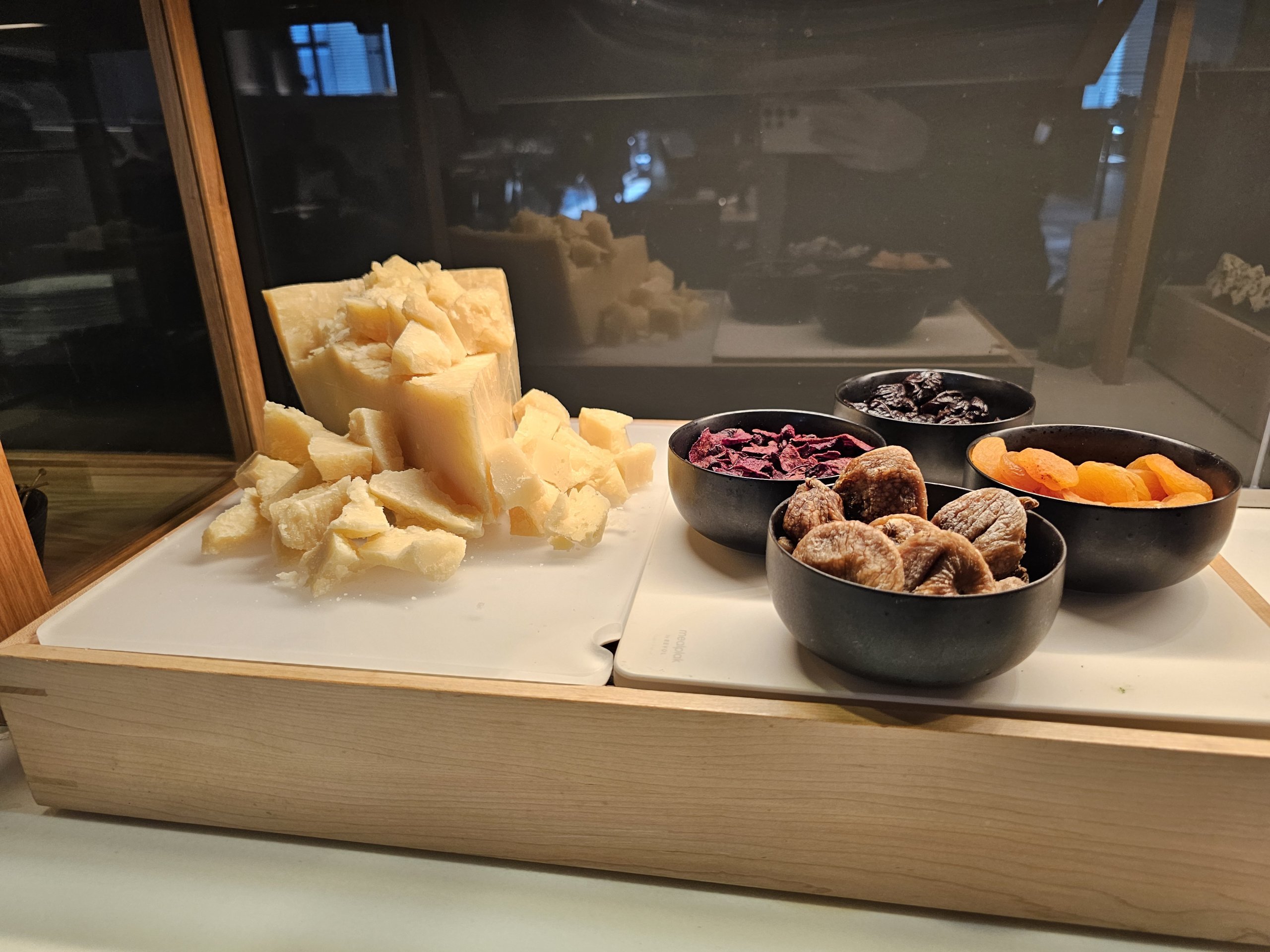 Suele haber 4 tipos de comida caliente para elegir e innumerables opciones más, como postres, ensaladas, quesos de calidad, frutos secos o miel.