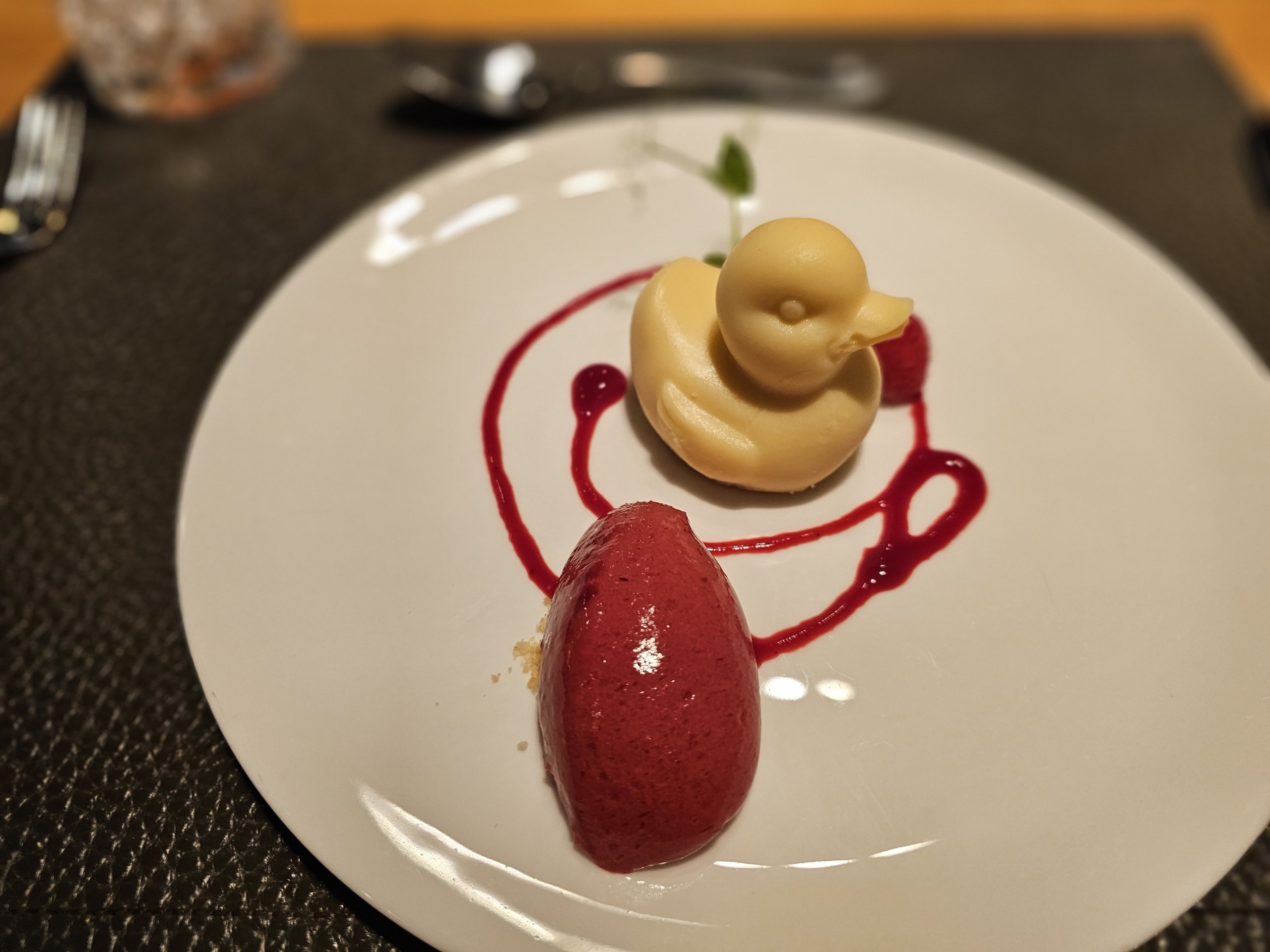 De postre, no puedo elegir otro que el emblemático pato de chocolate con leche y helado de frambuesa. Ahora que he empezado a coleccionar los patitos de plástico, que son diferentes en cada sala VIP de primera clase de Lufthansa, ¡tengo que probar el pato de chocolate!