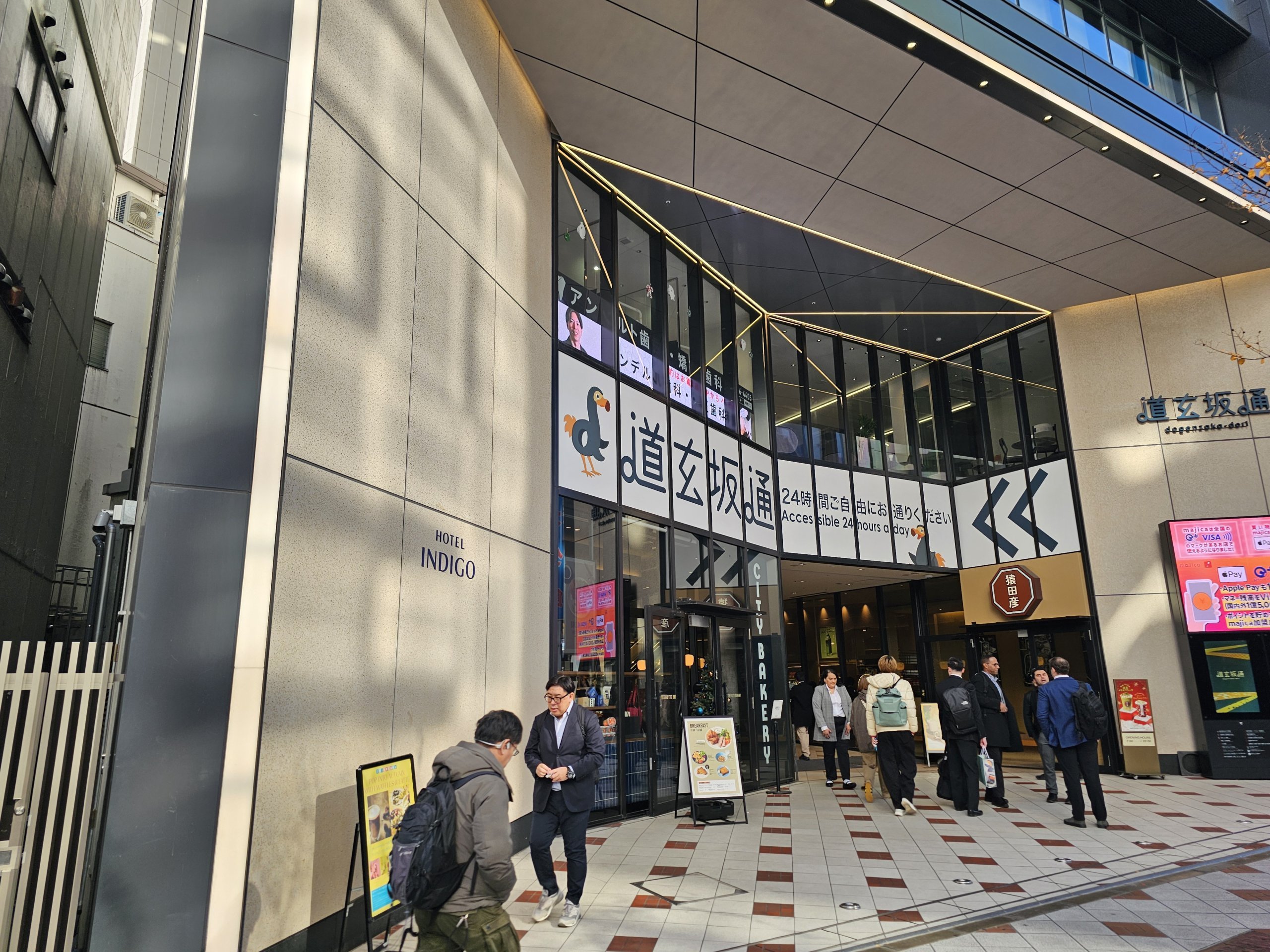 La entrada principal al hotel está en un callejón lateral, mientras que la entrada alternativa es desde el nivel de la calle a través del vestíbulo del centro comercial.